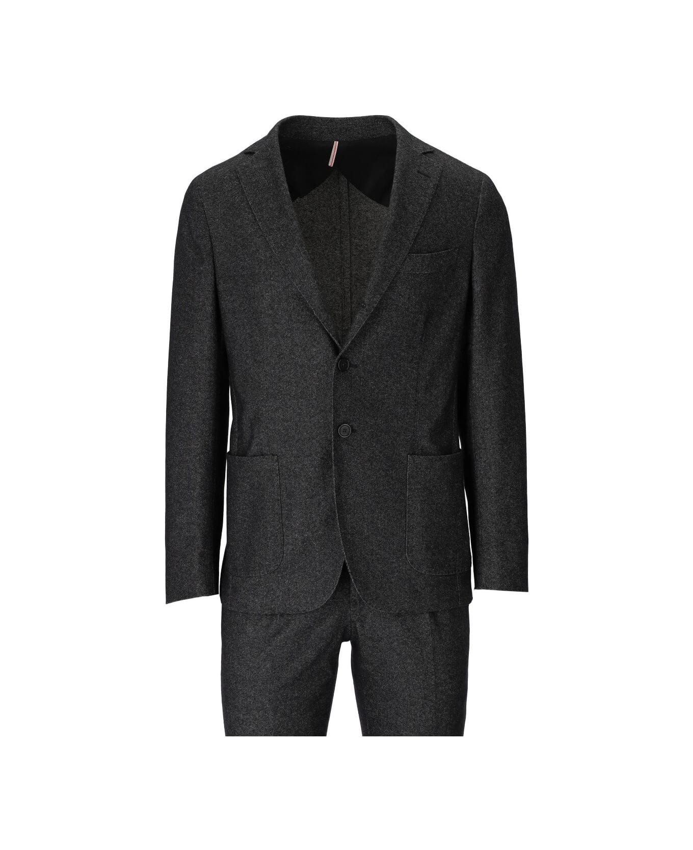 Santaniello suit made of denim-effect cotton wool blend in shades of dark grey. Single-breasted jacket with lapel collar, patch pockets on the front and slits on the back. Drop 7. Drop 6 trousers with slanted pockets on the front and slanted pockets on the back. Closure with zip and buttons. Slim fit.