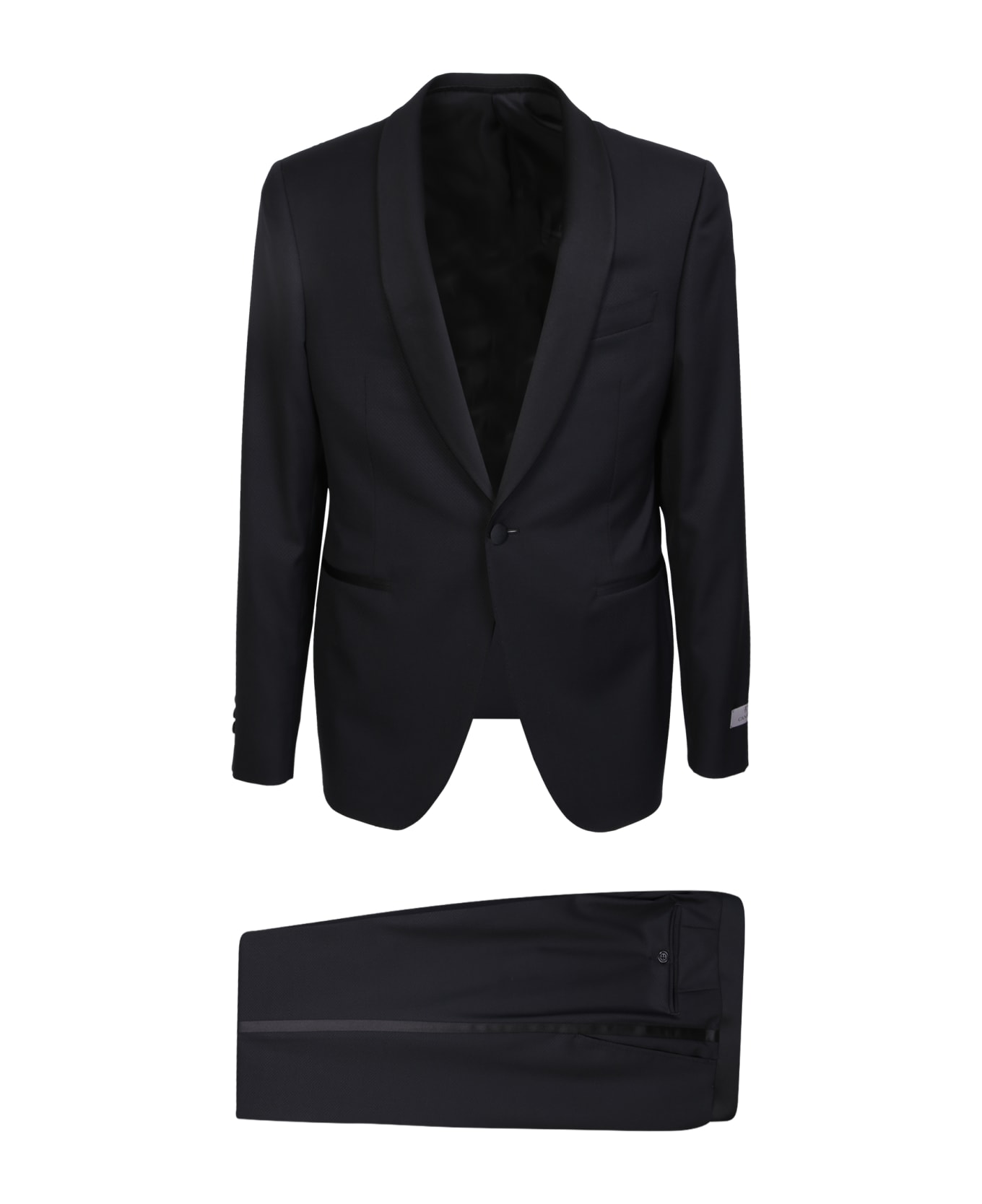 Jacket: Tailored cut. Front button fastening. Chest welt pocket. Two front jetted pockets. Trousers: Tailored cut. Concealed front fastening. Two diagonal pockets to the sides. Color: Black