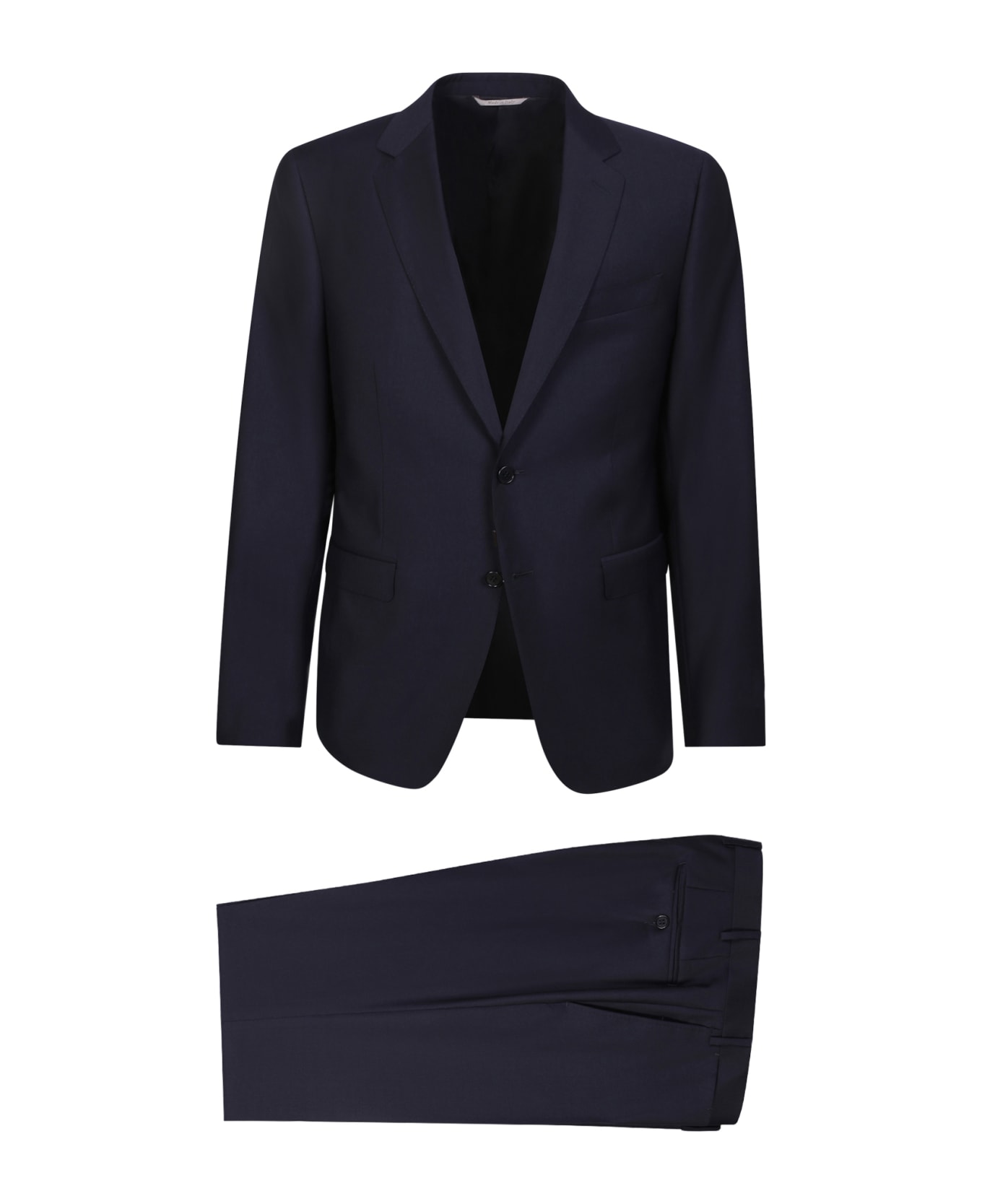 Jacket: Notched lapels. Chest welt pocket. Front button fastening. Two front flap pockets. Trousers: Mid-rise. Button fly fastening. Belt loops. Two side slit pockets. Two rear welt pockets. Color: Blue