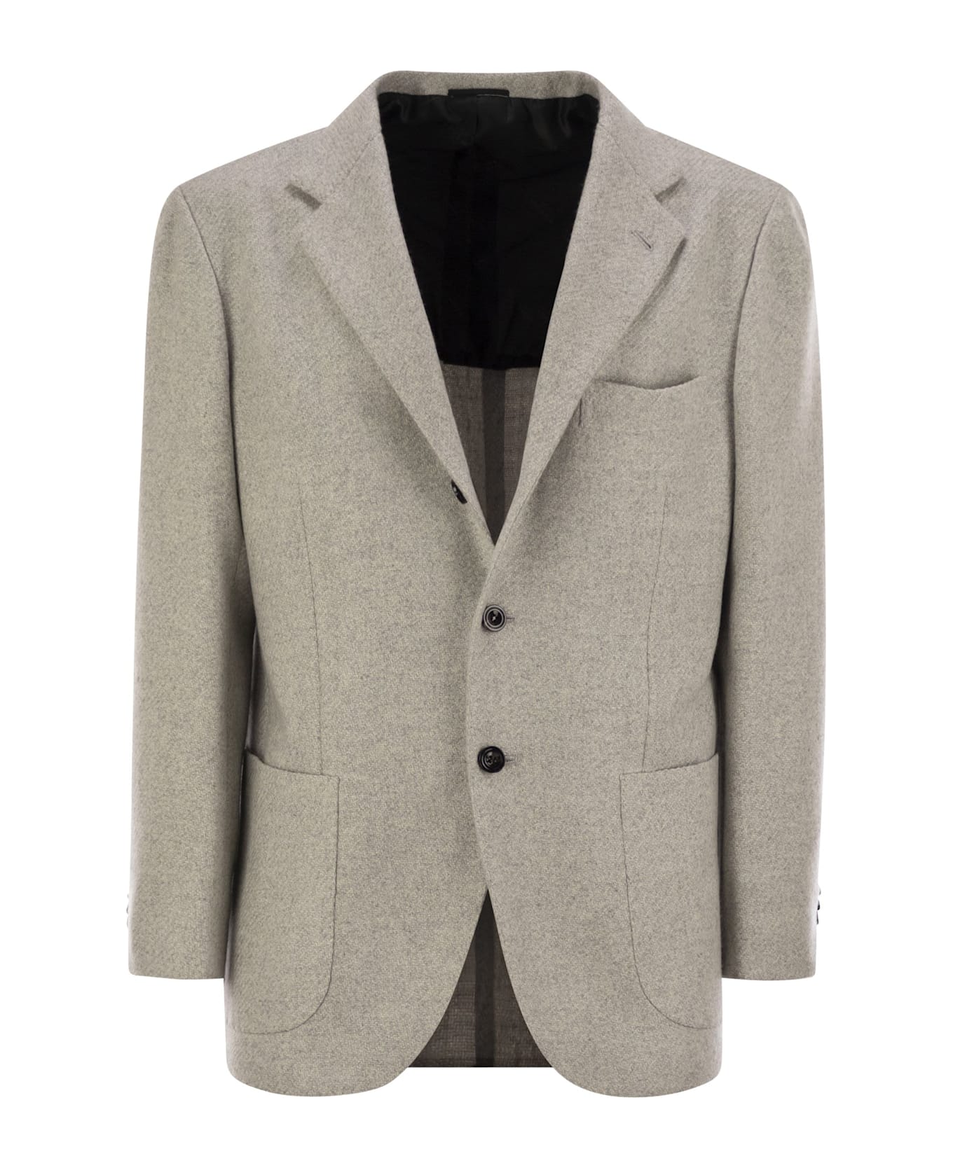 Single-breasted jacket in soft cashmere. Attention to fabrics has always been a cornerstone of Kiton: in the Biella wool mill they carry out continuous experimentation that has enabled them to create innovative textures and fibres with a particular focus on sustainability and environmental protection. The deconstructed structure of the garment, together with the softness of the yarn, offers an authentic and intimate experience of refined comfort that combines charm and freedom of movement. In a voyage of sartorial exploration and evolution that redefines the male wardrobe under the banner of essentiality, each Kiton jacket is a work of design: it is entirely cut and basted by hand in Naples by about 25 master craftsmen who create an architectural work of art created through 1800 steps. - Three double-ironed buttons - Patch pockets - Classic lapels DESIGNER ID: UG89K0109E01 001