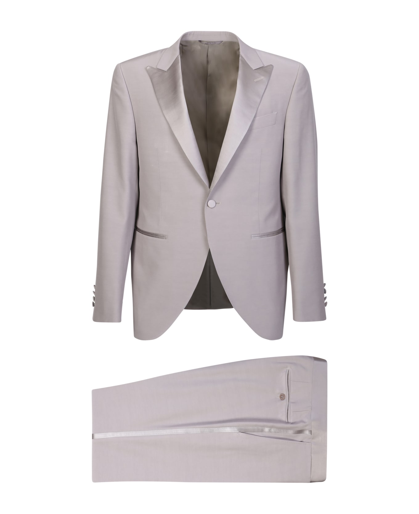 Jacket: Front button fastening. Chest welt pocket. Two side slit pockets. Buttoned-cuff sleeves. Trousers: Tailored cut. Concealed front fastening. Two side inset pockets. Two rear button-fastening jetted pockets. Color: Cool grey