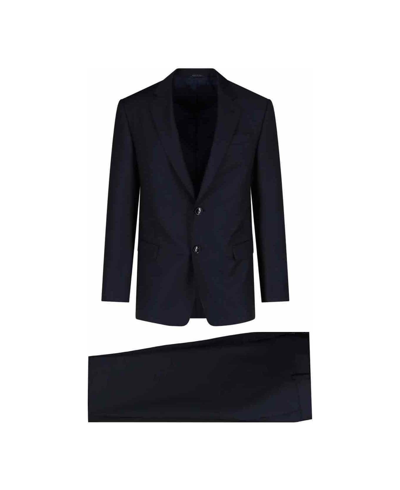 Giorgio Armani single-breasted suit, navy virgin wool and cashmere jacket, classic lapels, two-button closure, chest pocket, two side flap pockets, buttons on the cuffs, straight hem, chinos, mid waist, belt loops, button and zip closure, two side pockets, two back button welt pockets, straight leg.