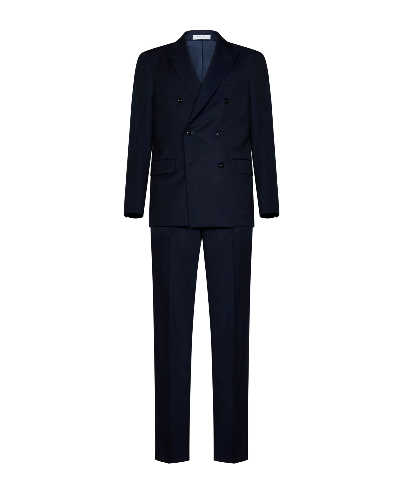 • Pants: Concealed front hook and zip closure, belt loops at waist, side slant pockets, back welt pockets, straight leg cut, stitched center crease; Light jacquard striped pattern