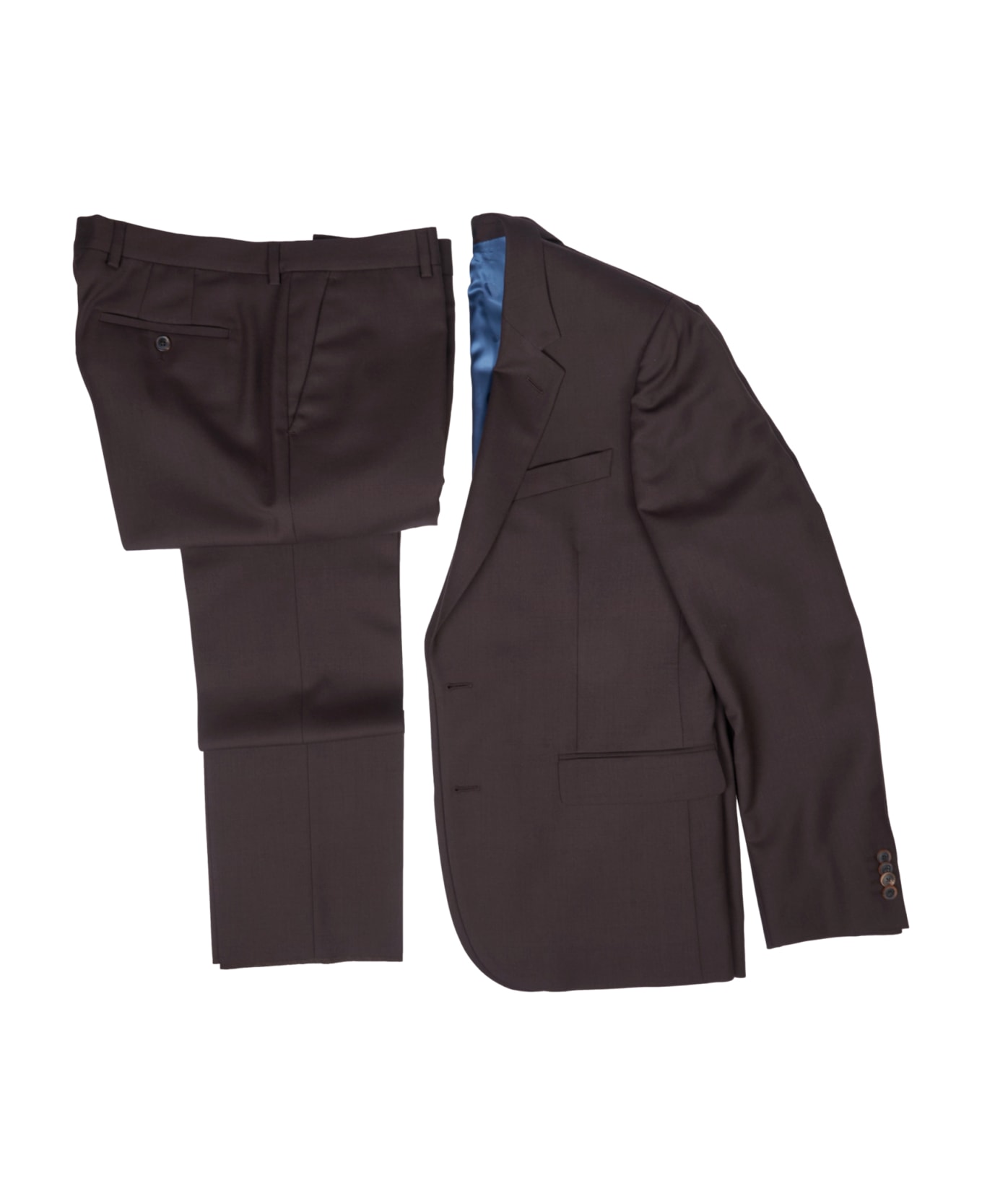 Brown suit. The jacket has 2 buttons, patch pockets and double rear vent. The trousers are dry and the bottom is 18. 5 cm. Composition: 100% wool. Made in Portugal.