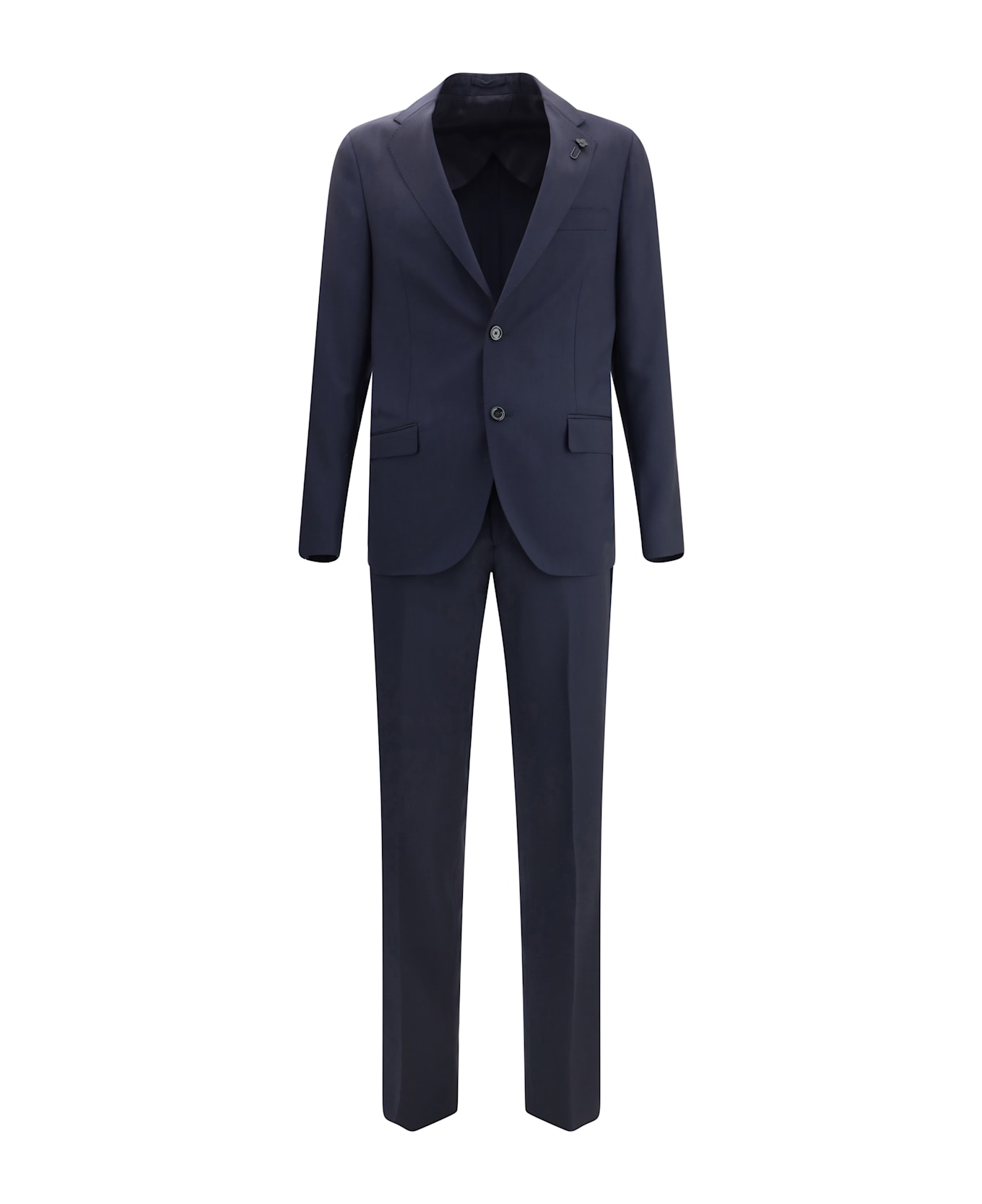 The lardini virgin wool suit is an elegant and sophisticated ensemble, perfect for formal occasions or for a refined everyday look. the blazer jacket features a front button closure and two patch pockets on the front, along with a slit pocket for a functional and aesthetic detail. the notched lapel, embellished with an iconic flower pin, adds a distinctive and luxurious touch. the classic trousers have a front zip and button closure, with two side slash pockets and two welt pockets on the back, for practicality without compromising on style. the belt loops at the waist complete the design, offering the possibility to add a personal touch to the ensemble. a suit that combines tradition, elegance and functionality.