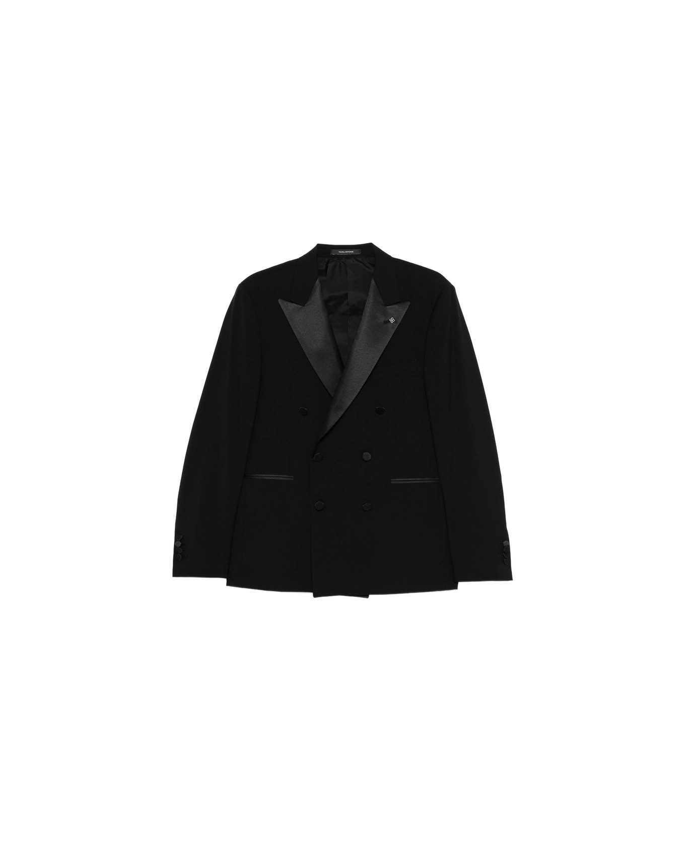 black satin-peak lapel double-breasted closure besom pockets button cuffs