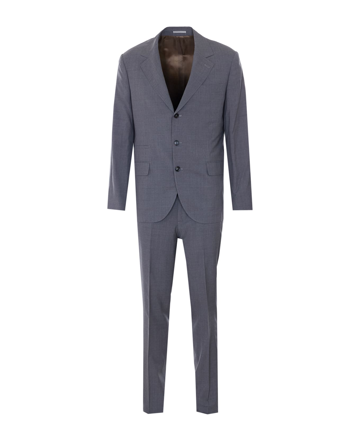 Brunello Cucinelli grey suit, jacket with frontal buttons closure, long sleeves, buttons on cuffs, pants with button and zip closure, lateral pockets, regular fit Composition: 85% Wool, 15% Silk, 100% Cupro
