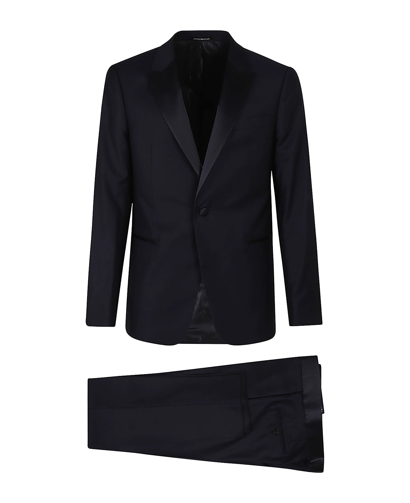 Men`s tuxedo suit with slim fit, one-button jacket with revere and satin-covered buttons, the trousers have a satin belt edge.