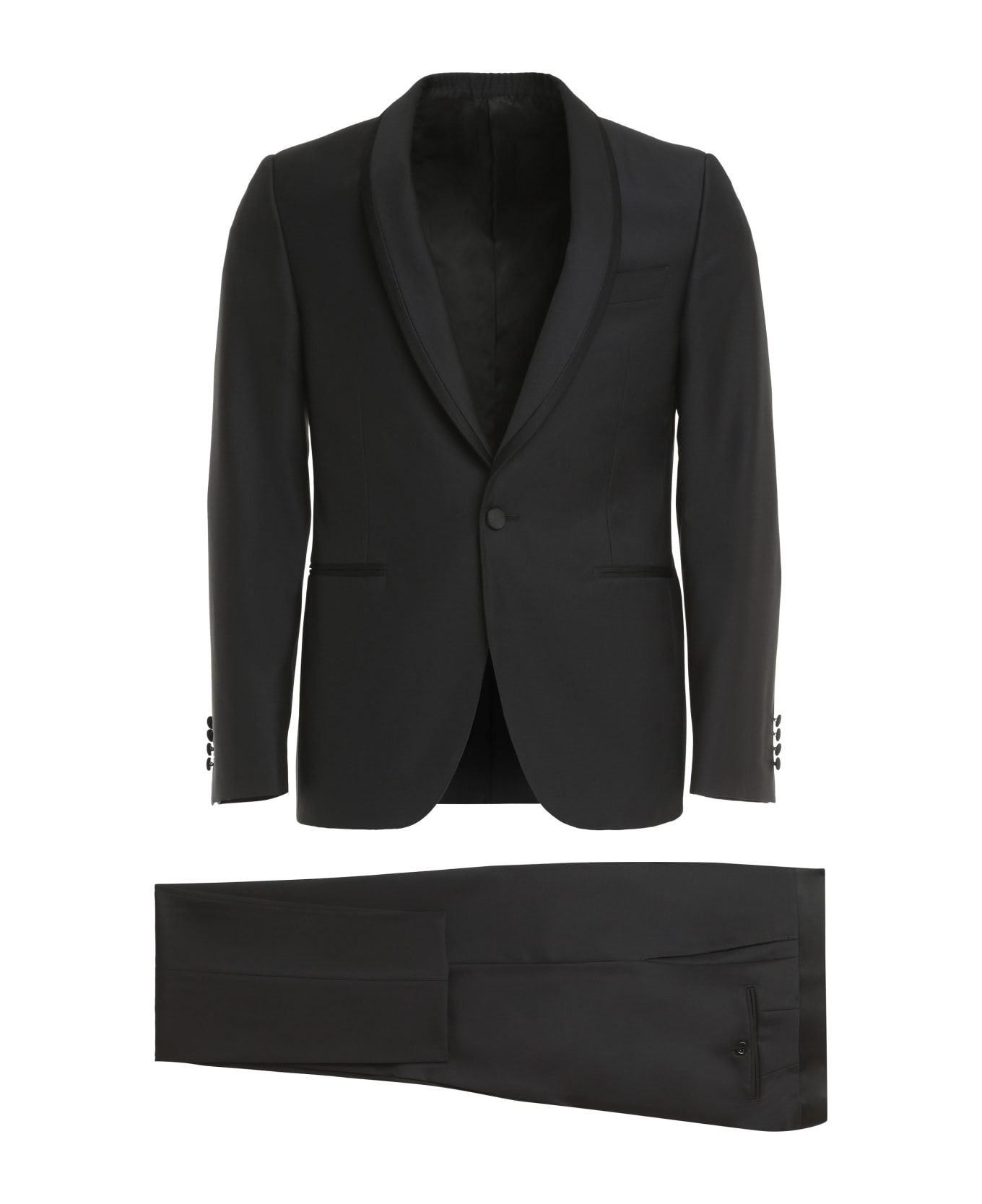 Single-breasted one button jacket lapel collar padded shoulders two welt pockets and chest pocket on the front two internal pockets buttoned cuffs hem with double back slit trousers: zip and buttons closure two side pockets two back buttoned welt pockets 100% wool Composition: 100% % Wool