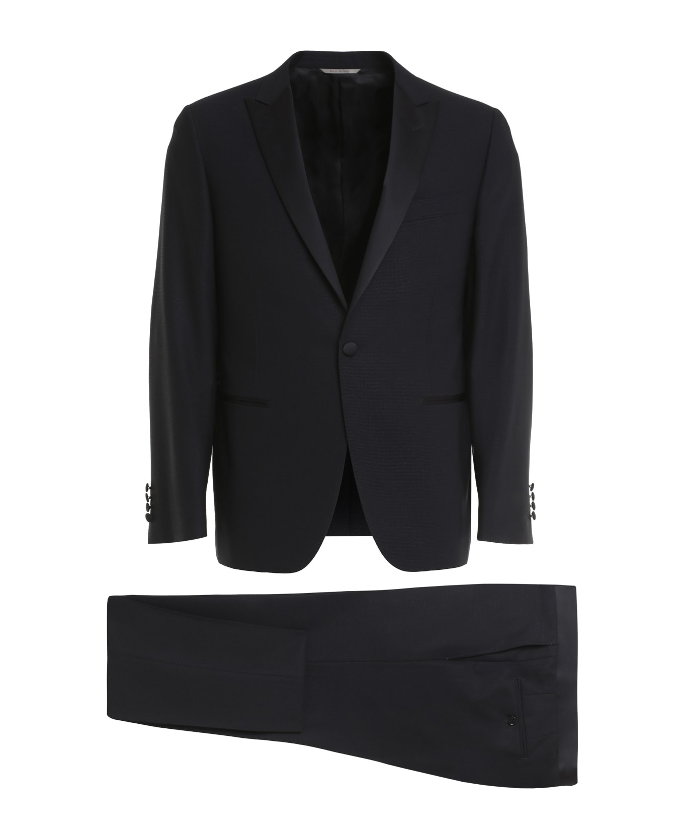 Single-breasted one button jacket lapel collar padded shoulders two welt pockets and chest pocket on the front two internal pockets hem with double back slit trousers: zip and buttons closure two side pockets two back buttoned welt pockets 100% wool Composition: 100% % Wool