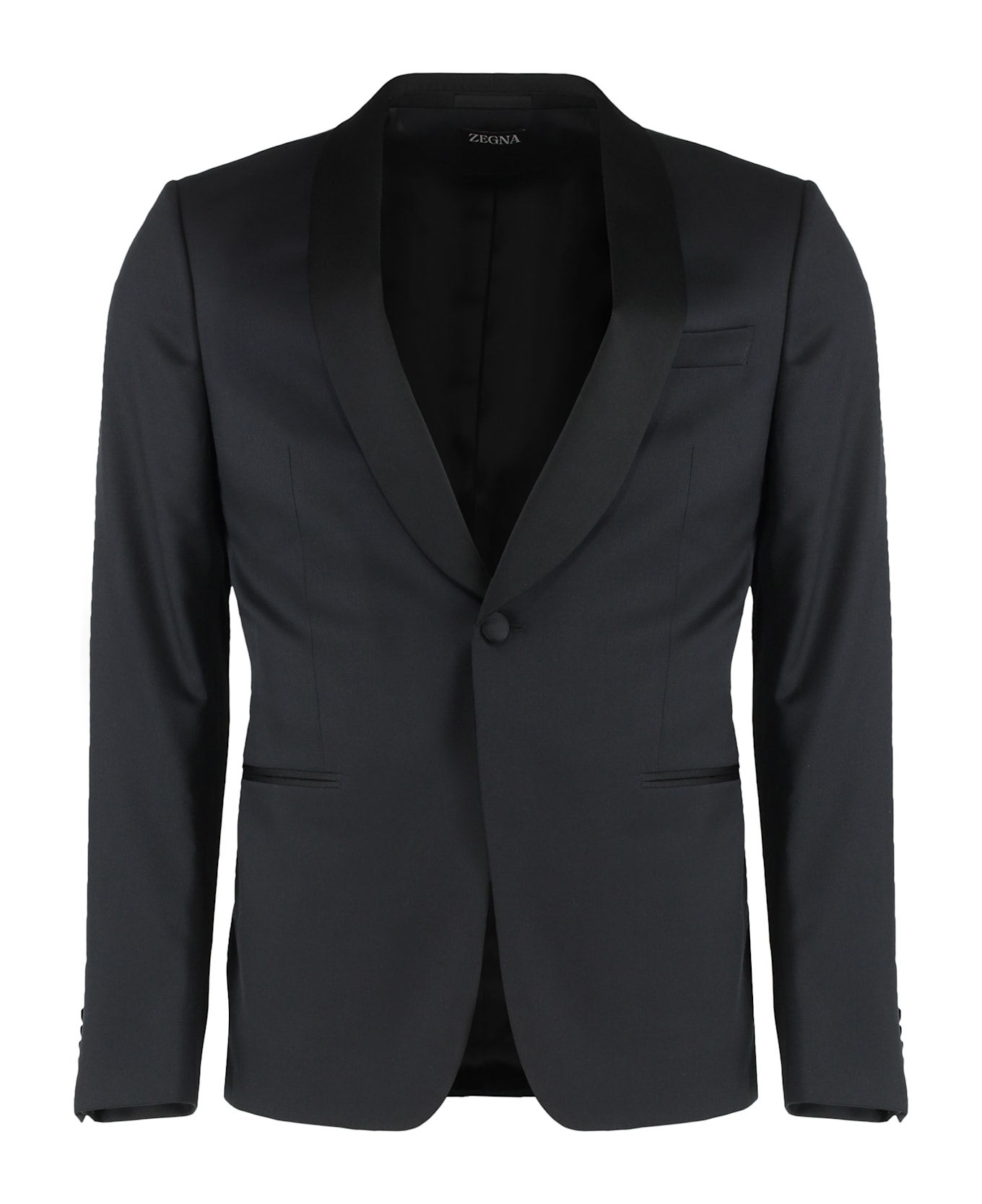 Satin lapel collar two welt pockets and chest pocket on the front hem with double back slit trousers: belt loops two side pockets two back welt pockets 100% wool, 100% viscose Composition: 100% % Wool, 100% % Viscose