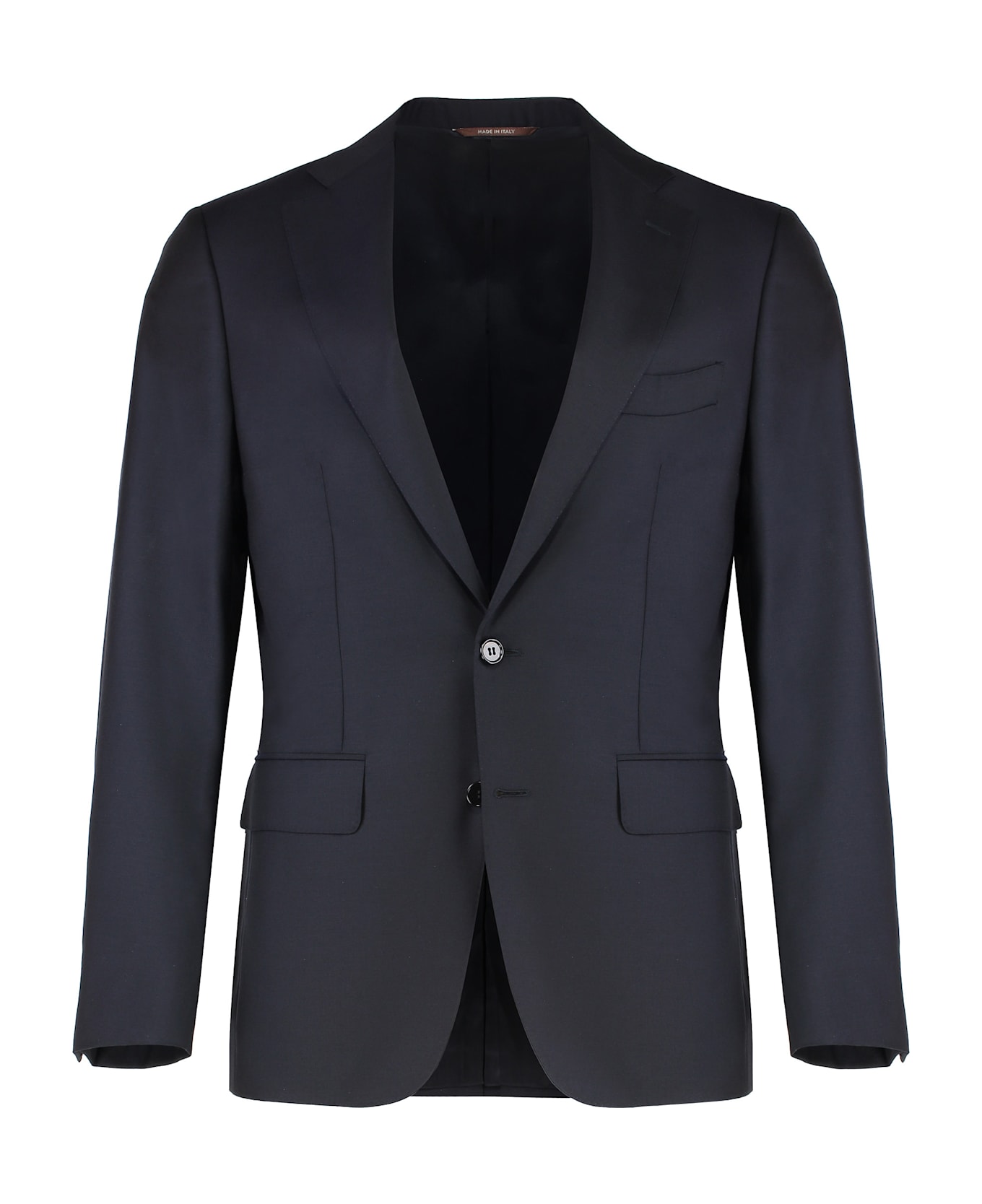 Single-breasted two-button jacket lapel collar two front flap pockets and chest pocket buttoned cuffs hem with double back slit trousers: two side pockets two back welt pockets 100% wool Composition: 100% % Wool