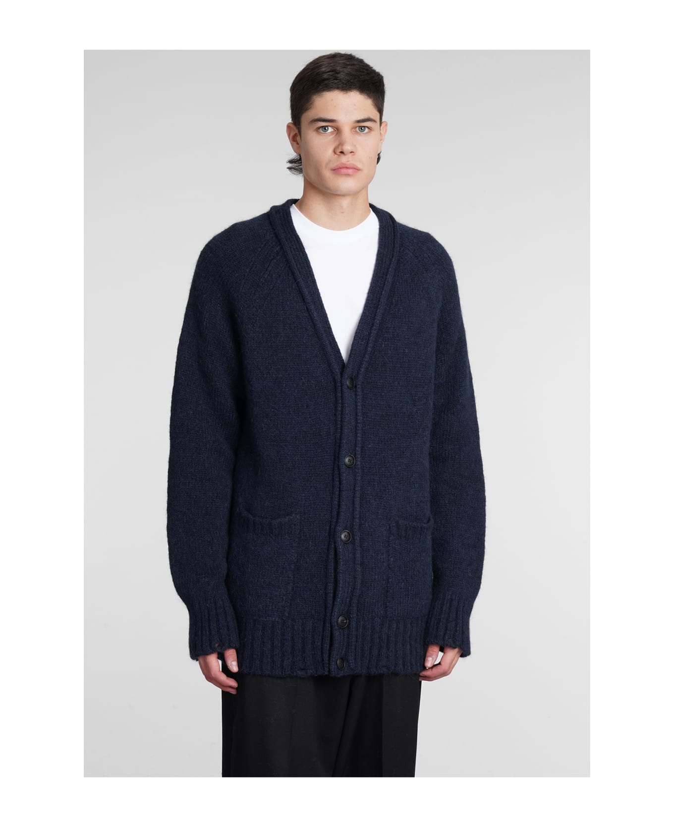 Cardigan in blue wool, V neck, long sleeves, ribbed cuffs and bottom, pockets on side, 56% alpaca, 34% polyamide, 10% wool, Made in Italy, Model is 1. 83 and wears size 46