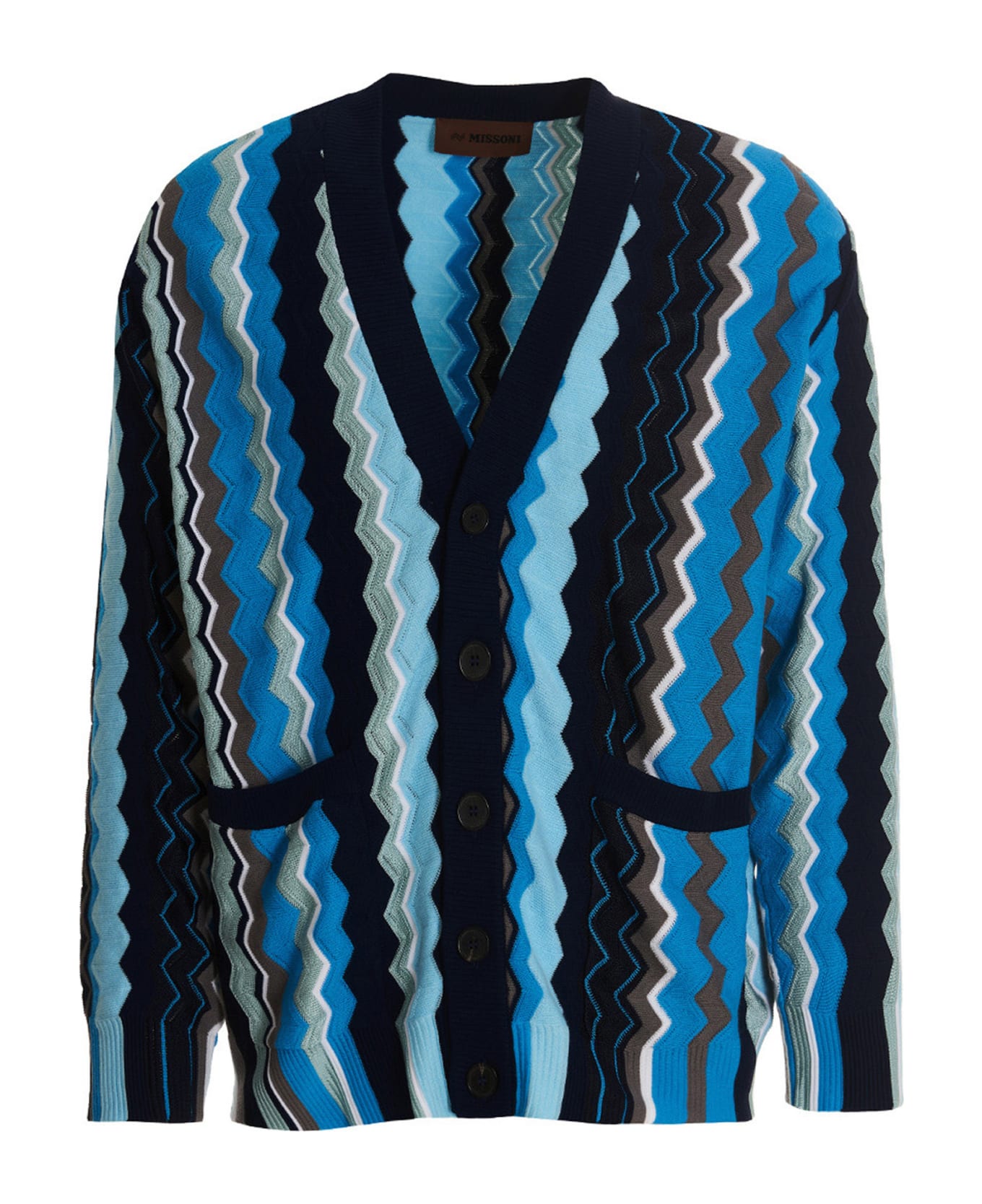Cotton blend cardigan with an all-over 'Zig Zag' pattern, a button closure, pockets, and long cuffed sleeves.