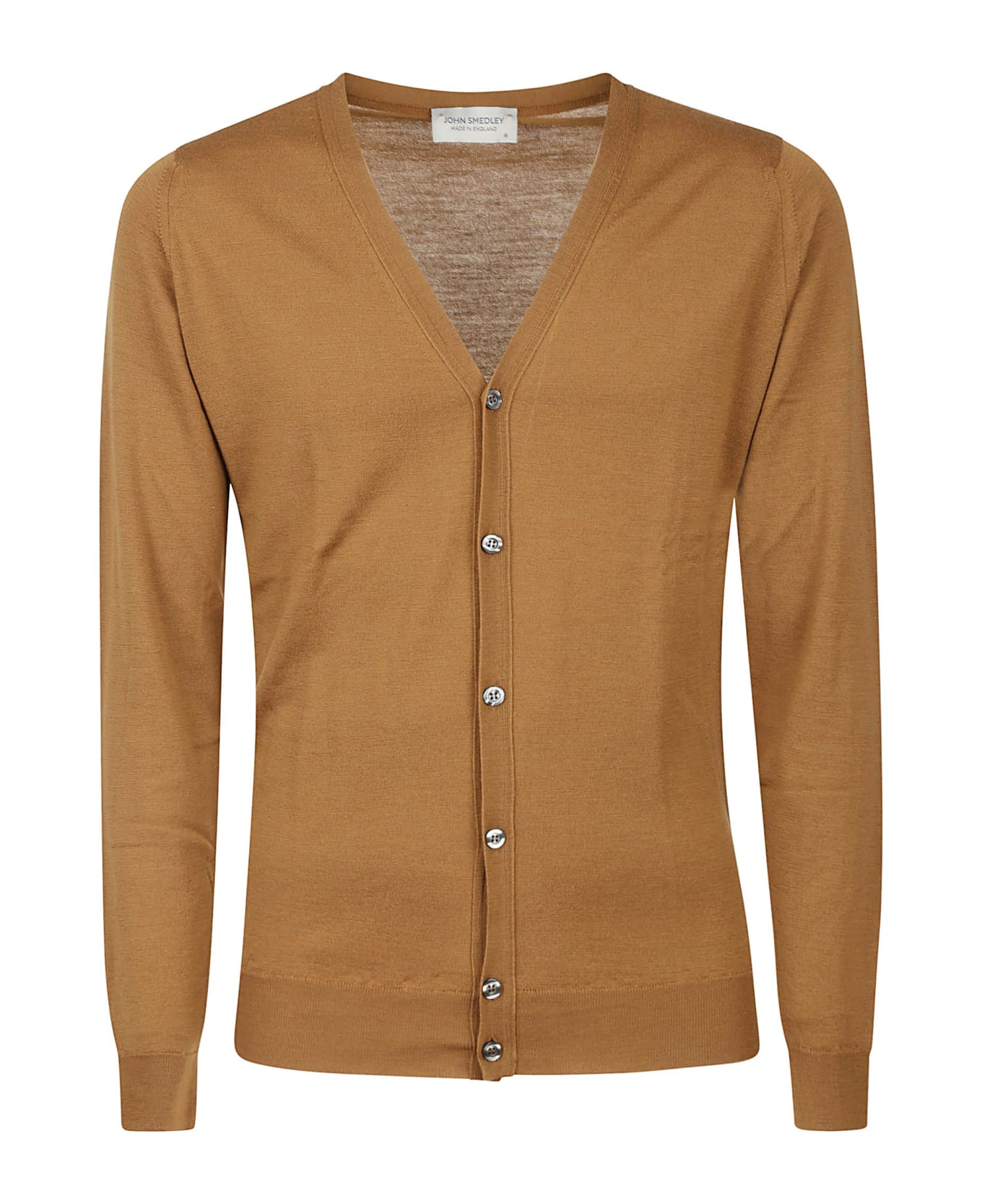 John Smedley Camel merino wool cardigan, button closure, ribbed edges.