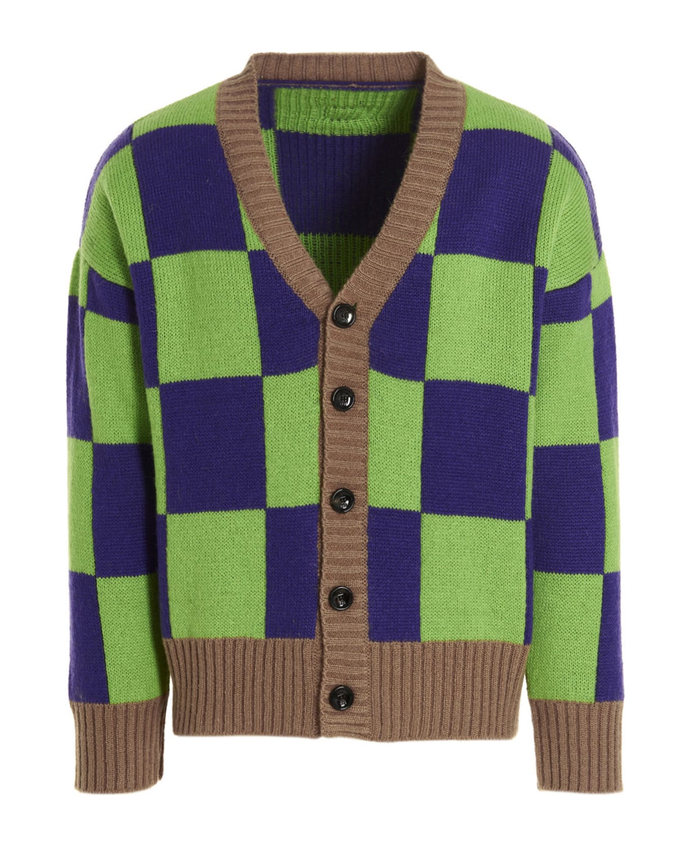 'Checkerboard' wool blend cardigan with button closure and long cuffed sleeves.