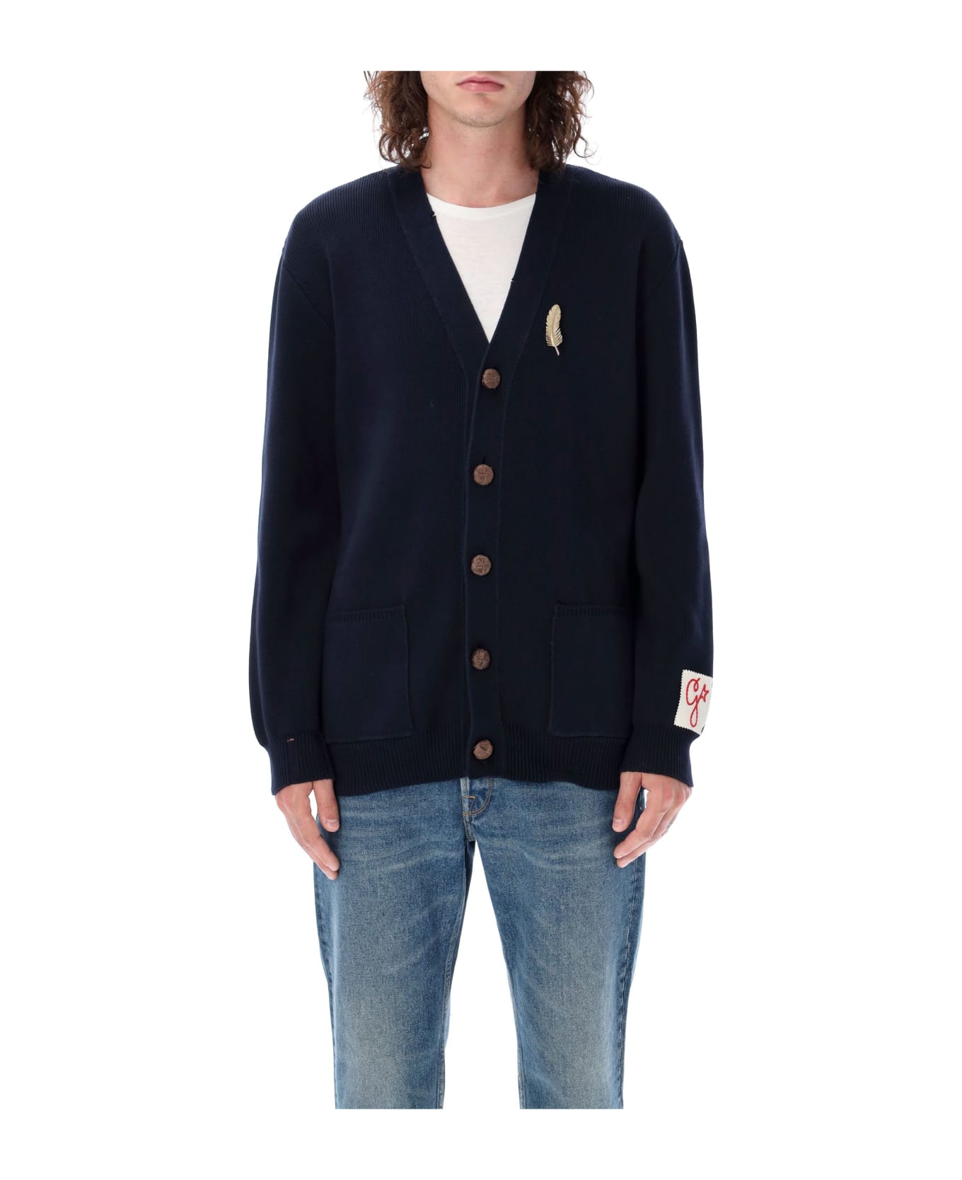 Cotton-blend Daniel Basic Cardigan By Golden Goose. Featuring: V-neck Rib Trim Front Button Fastening Two Patch Pockets Gold-tone Feather Pin Detail Long Sleeves Distressed Details Model Is 1,90 M Tall And He Is Wearing Size L