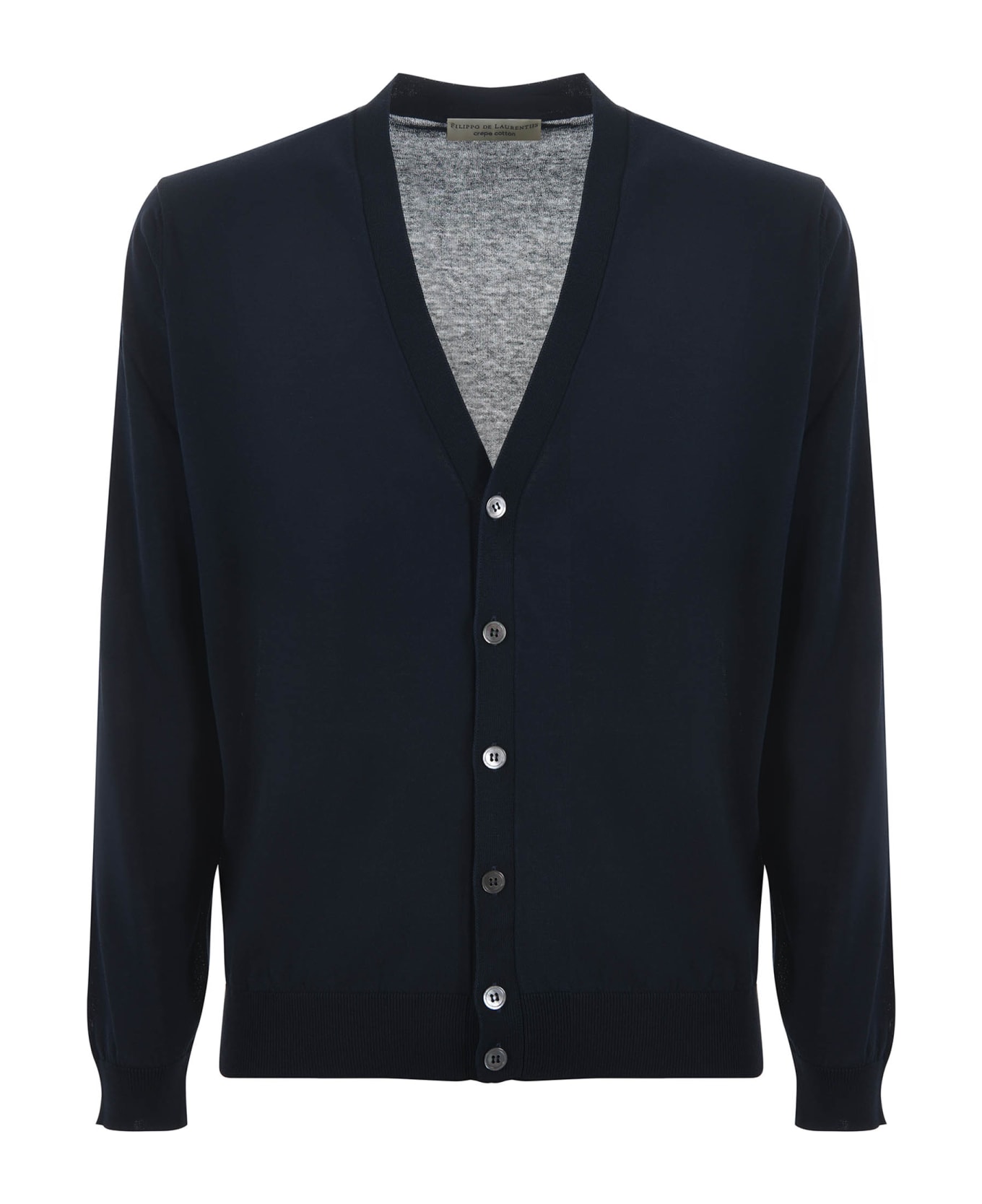 Filippo De Laurentiis cardigan in dark blue cotton thread. V-neckline. Long sleeve. Button closure. Ribbed cuffs and bottom. Measurement in photo: 50 100% cotton