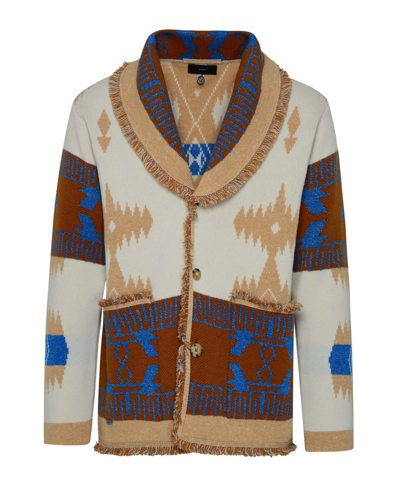 Lapel collar, button closure, two slip pockets on the front, logo plaque on the front, all-over Icon pattern, frayed trims. Composition: 80% cashmere, 20% flax