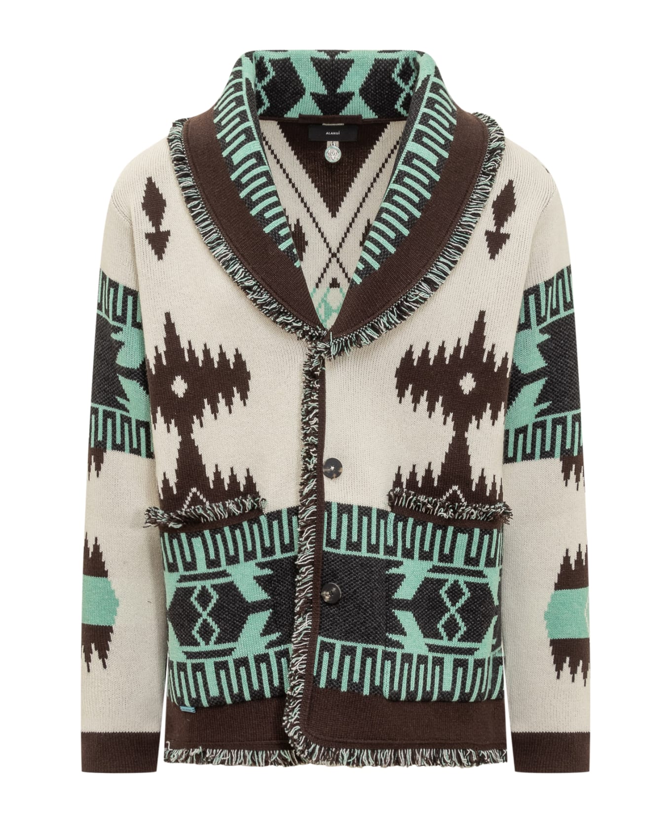 V-neck cardigan. Button closure. Fringed edges. Covered with jacquard geometric pattern. Front pockets. Composition: 100% Cashmere