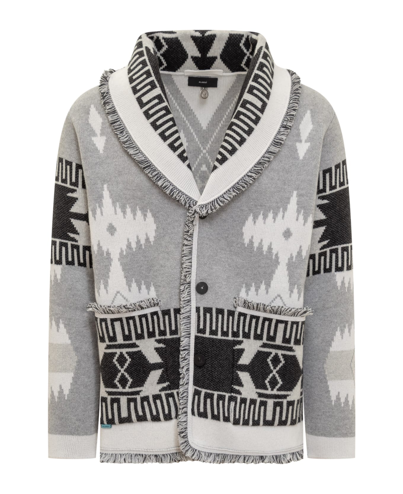 V-neck cardigan. Button closure. Fringed edges. Covered with jacquard geometric pattern. Front pockets. Composition: 100% Cashmere