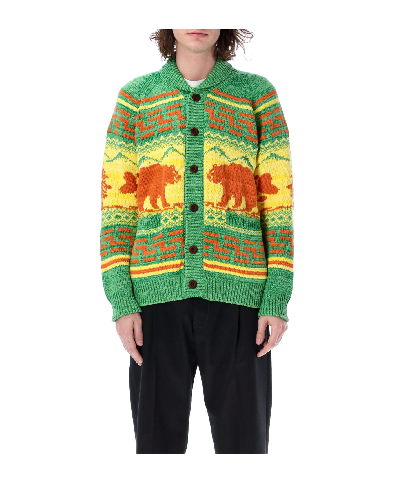 Jacquard Bear Cardigan By Junya Watanabe. Featuring: Ribbed Round Neck Buttons Closure Multicolor Jacquard Motif All-over Long Sleeves Front Pockets Rib Trims The Model Is 1,90 M Tall And He's Wearing Size L