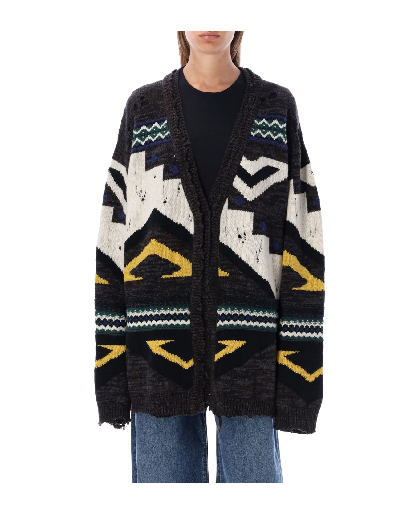 Cashmere Jacquard Cardigan By Ramael. Featuring: V-neck Concealed Snap Buttons Closure Multicolor Jacquard Motif All-over Long Sleeves Dropped Shoulders Worn Effect Relaxed Fit