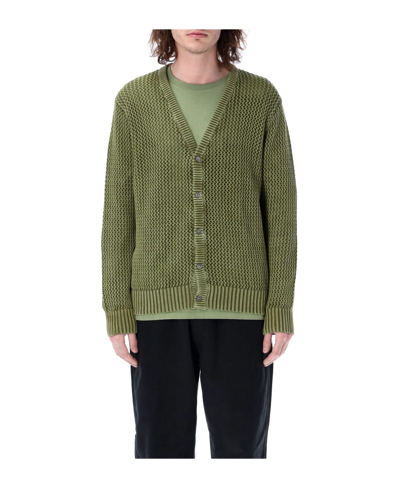 Cotton Loose Gauge Cardigan By Stüssy. Featuring: V-neck Buttons Closure Long Sleeves Stüssy Original Stock Flag Label At Side Seam Rib Trims The Model Is 1,90 M Tall And He's Wearing Size L