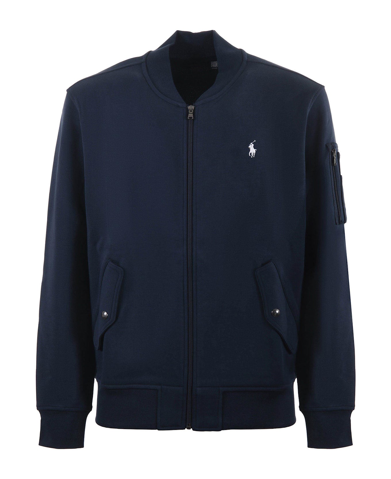Polo Ralph Lauren Cotton Blend Sweatshirt Dark Blue. Ribbed knit collar. Flap pockets. Zip pocket on left sleeve. Embroidered front logo. Ribbed cuffs and hem. Zip closure. Size in photo M 66% cotton, 34% polyester