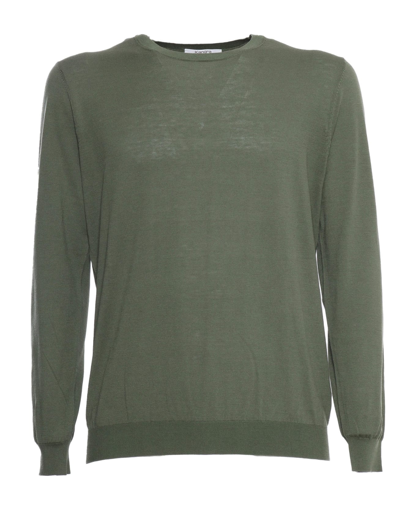 Sage green crew-neck sweater in silk and shaved cotton blend, ribbed hems.
