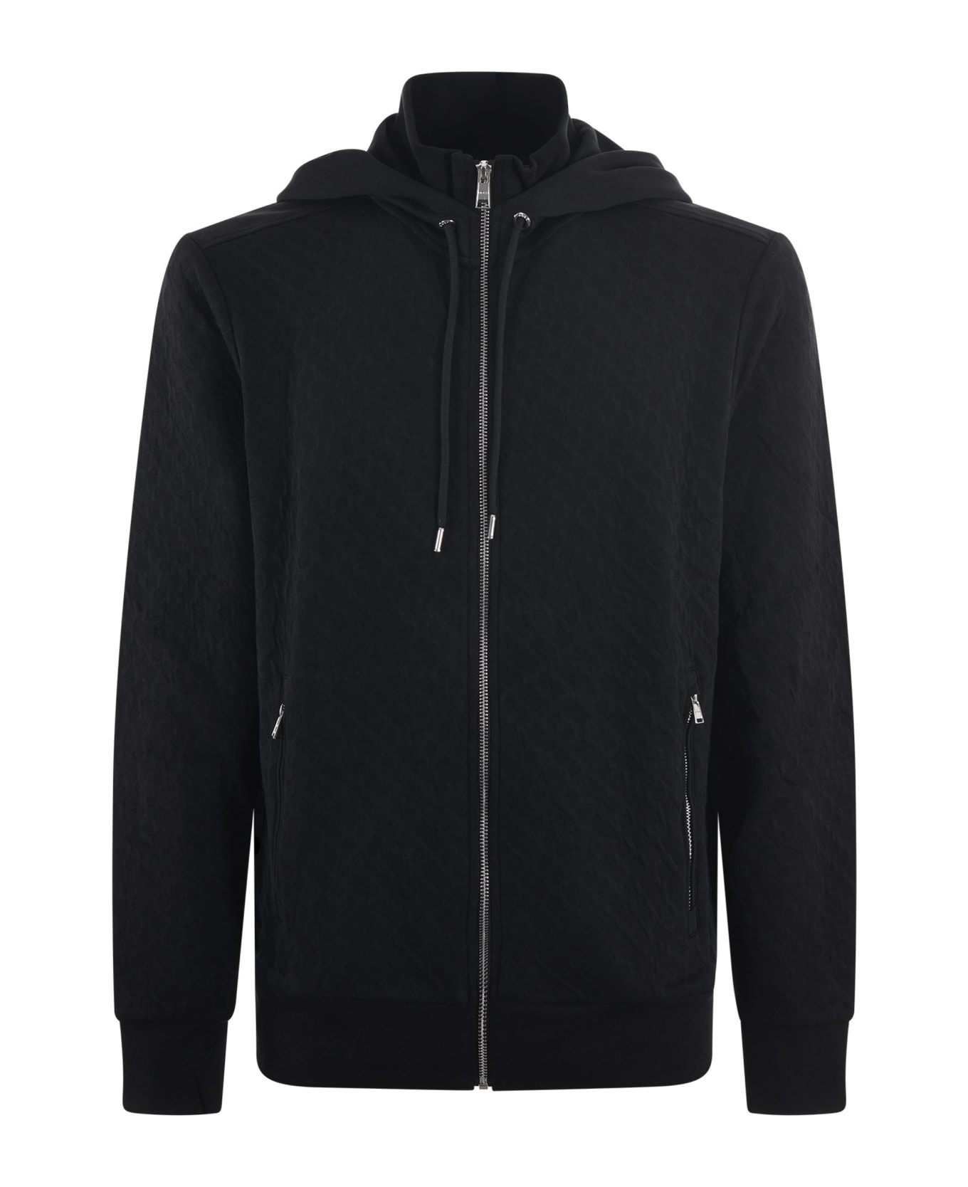 Boss sweatshirt in black stretch cotton. Tonal monogram weave. Ribbed high collar with drawstring hood. Zipped pockets. Zip closure. Ribbed cuffs and bottom. Measurement in photo M 99% cotton, 1% elastane