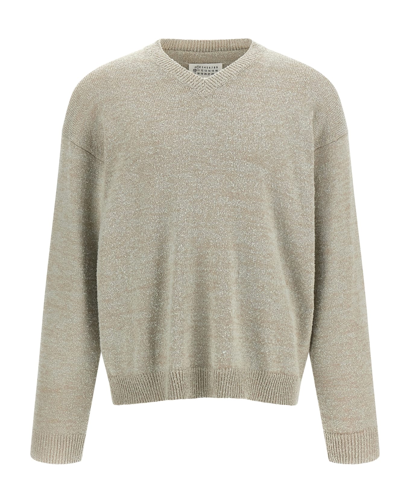 Bouclé cotton and wool blend sweater, V-neck, long cuffed sleeves, dropped shoulders, 'Four stitches' at the back. Composition: 84% cotton 9% wool 6% polyamide 1% elastane