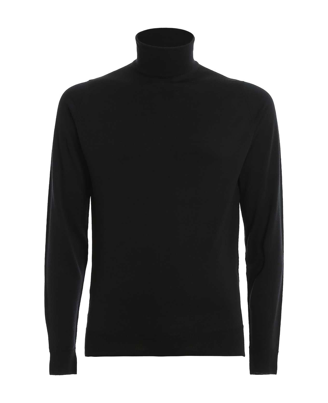 John Smedley Black merino wool turtleneck, ribbed collar, cuffs and bottom, slim fit.