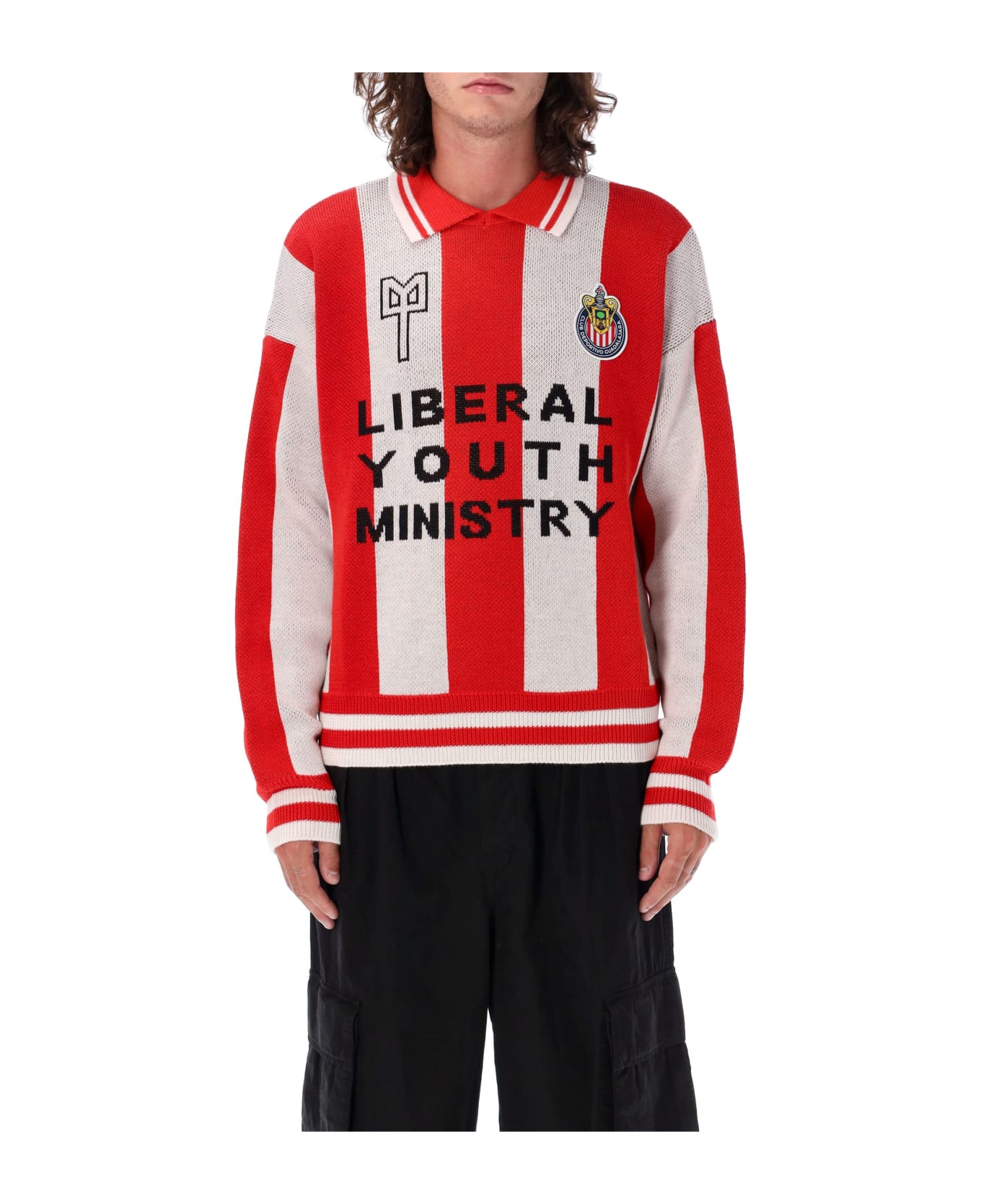 Chivas Football Sweater By Liberal Youth Ministry. Featuring: Point Collar Long Sleeves Ribbed Neck And Cuffs Football Patch At Chest Logo Lettering At Front Football Uniform Style Contrasting Stripes Pattern Knitted Trim Relaxed Fit The Model Is 1,90 M Tall And He's Wearing Size L