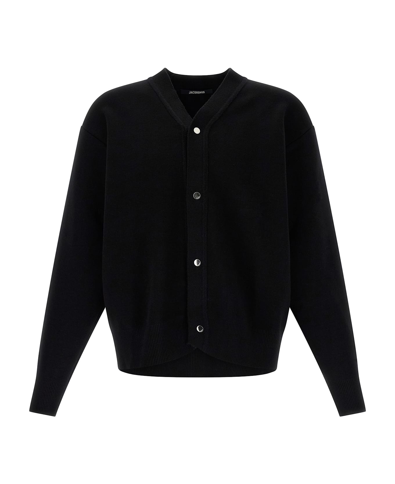 'Le Cardigan Doppio' cardigan in heavy merino wool blend, V-neck, front metal button closure, long sleeves with cuffs and dropped shoulders. Composition: 90% merino wool 6% polyamide