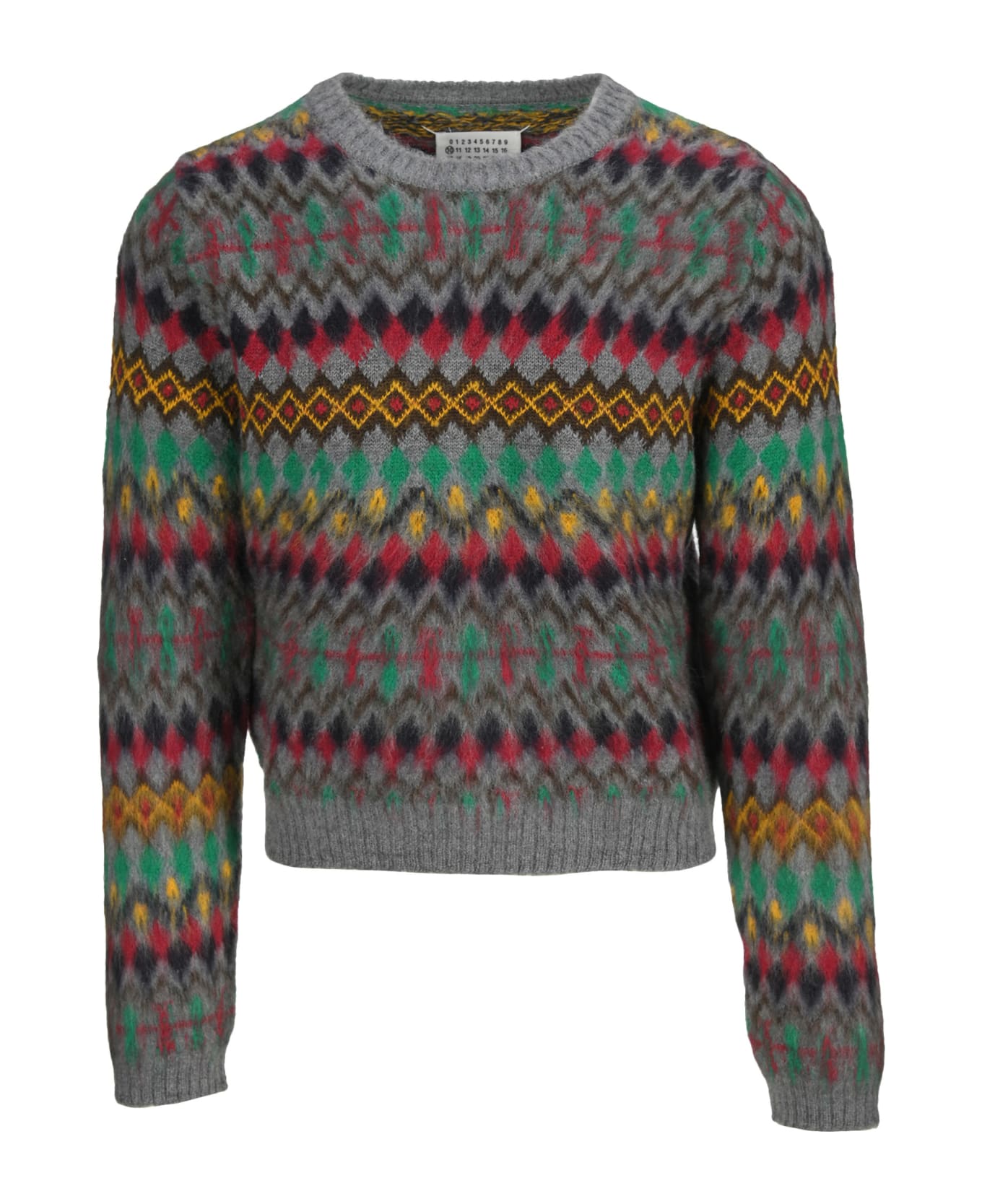 Grey Wool Intarsia-knit Crew-neck Jumper By Maison Margiela. Featuring: - Ribbed Crew Neck - Long Sleeves - Shrunken Effect - Multicolor Blurred Fair Isle Pattern All-over - Ribbed Hem And Cuffs - Cropped