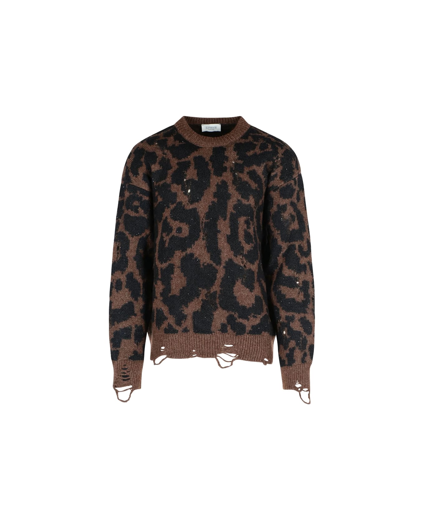 brown leopard print ribbed crew neck dropped shoulder frayed trims