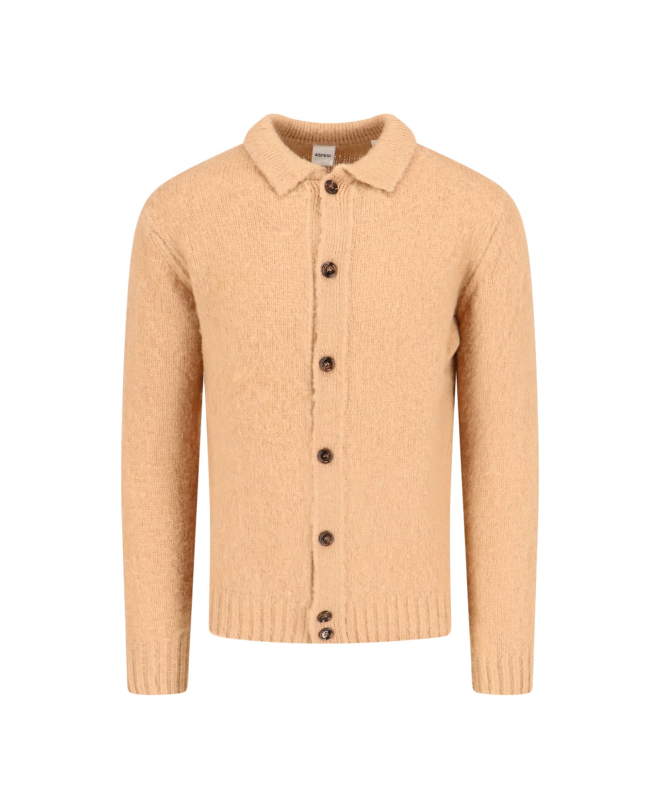 Aspesi beige wool cardigan knitted, classic collar, button closure, ribbed trims, straight hem.