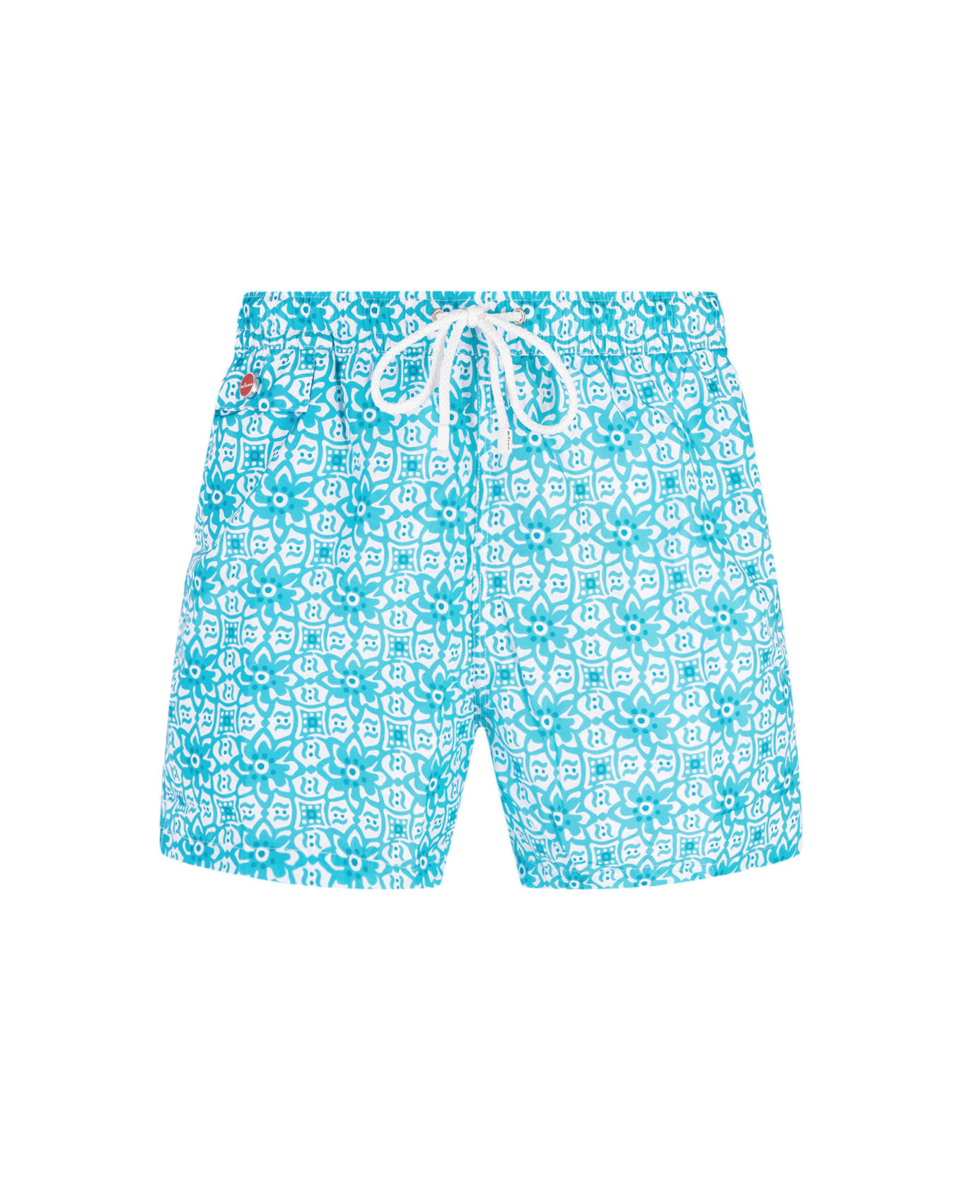 Kiton beach shorts made of aquamarine-colored polyester fabric with all-over printed majolica pattern. Model characterized by front logoed application, elasticated waist with white drawstring and back pocket with logoed flap and Velcro closure. Composition: 100% Polyester