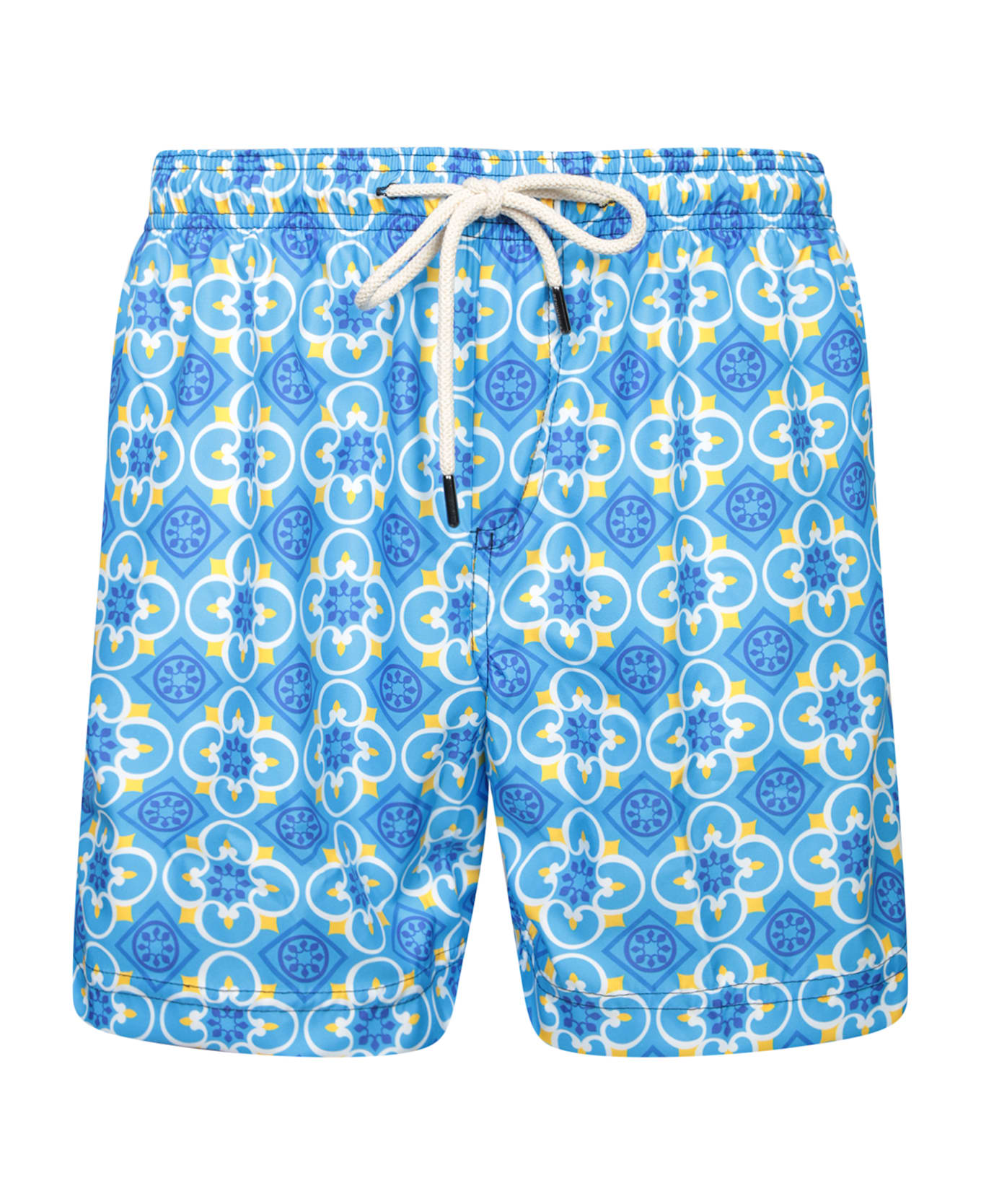 Discover seaside elegance with the Peninsula swim boxer shorts, featuring a bold graphic pattern in vibrant blue and yellow. Equipped with adjustable drawstrings and a practical back pocket, it's ideal for every summer adventure.
