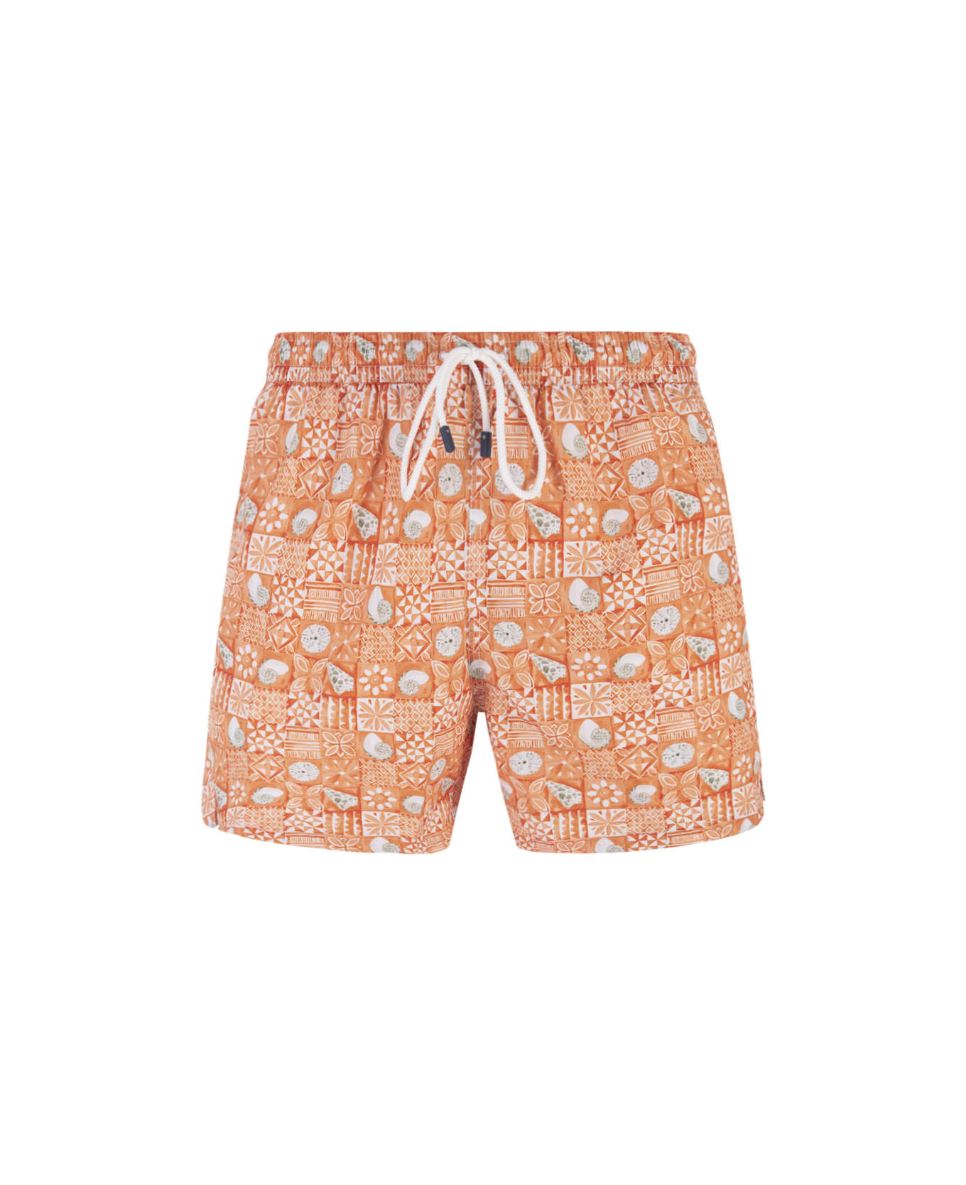 Fedeli swimsuit made of recycled technical fabric with all over orenge majolica and blue shell print. Elasticated waist with drawstring, side welt pockets. On the back, metal snap hook and pocket with flap and logo patch. Composition: 100% Recycled Polyester