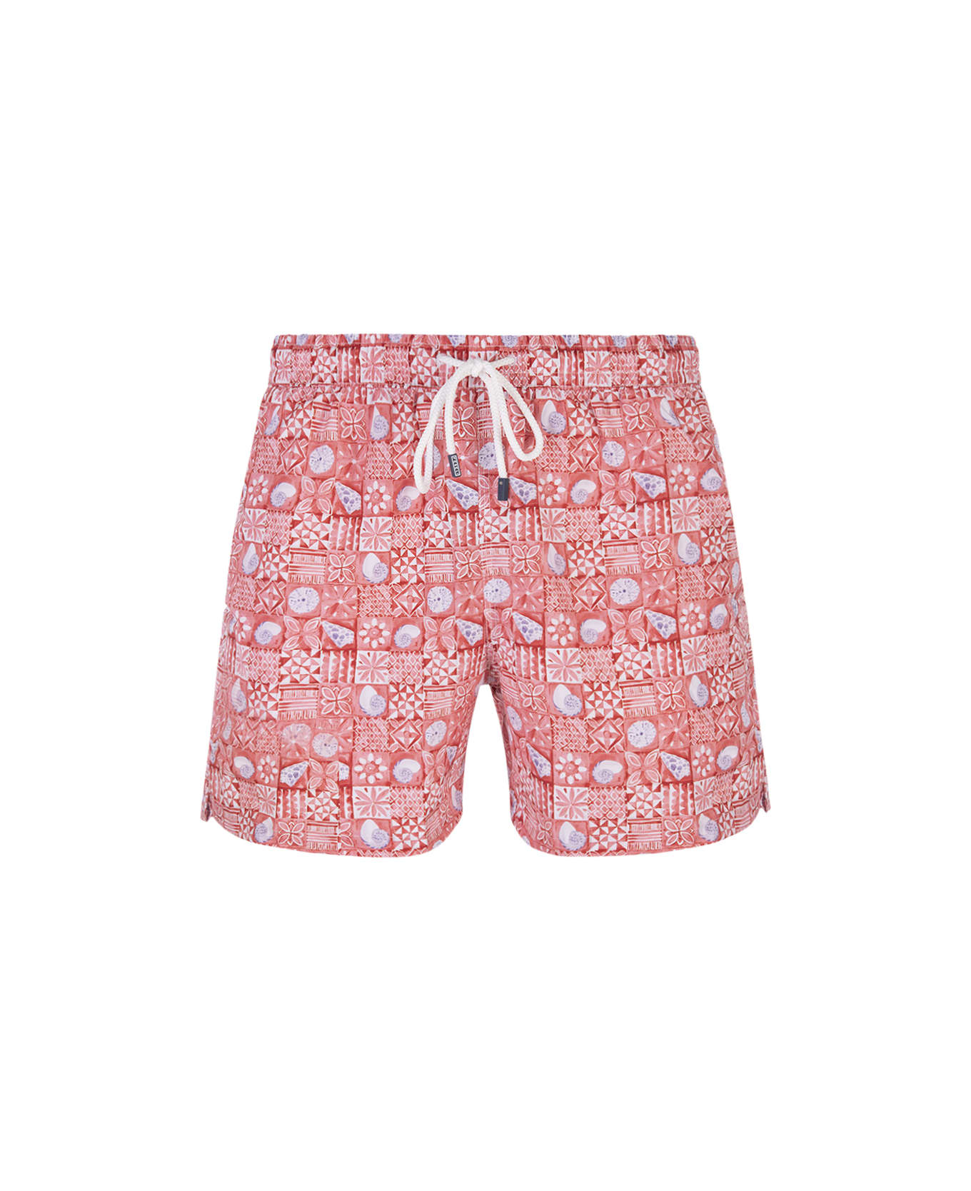 Fedeli swimsuit made of recycled technical fabric with all over red majolica and blue shell print. Elasticated waist with drawstring, side welt pockets. On the back, metal snap hook and pocket with flap and logo patch. Composition: 100% Recycled Polyester