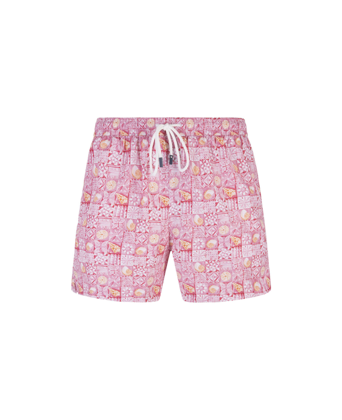 Fedeli swimsuit made of recycled technical fabric with all over majolica shell print. Elasticated waist with drawstring, side welt pockets. On the back, metal snap hook and pocket with flap and logo patch. Composition: 100% Recycled Polyester