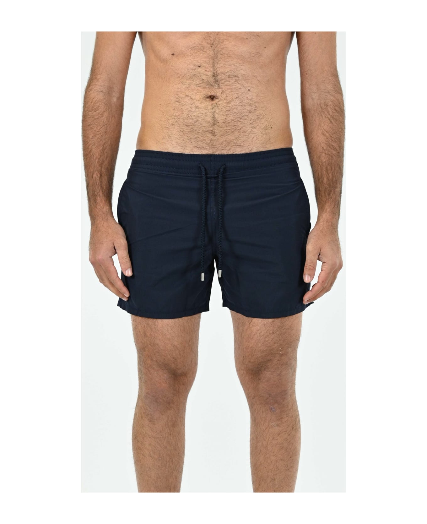 vilebrequin swimsuit made of navy blue recycled lycra. featuring an elasticated waistband with drawstring, side pockets, back patch pocket and internal mesh briefs. the logo label applied on the back completes the design. 100% recycled polyamide; lining: 100% polyamide
