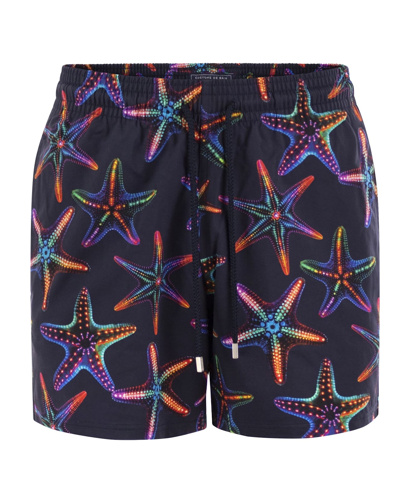 Timeless men's short swimsuit embellished with a contrasting navy-inspired print. Shorter-cut model made of recycled polyamide and elastane for a comfortable fit. - Shorter-cut swim shorts in stretch fabric - Elasticized waistband with drawstring and Vilebrequin logo engraved on zamak ends - Two side pockets and one back couture pocket with Velcro closure - Two back grommets allow water to drain away to reduce the balloon effect when exiting the water - Slightly shorter than the classic Moorea model DESIGNER ID: MSOCF107 390