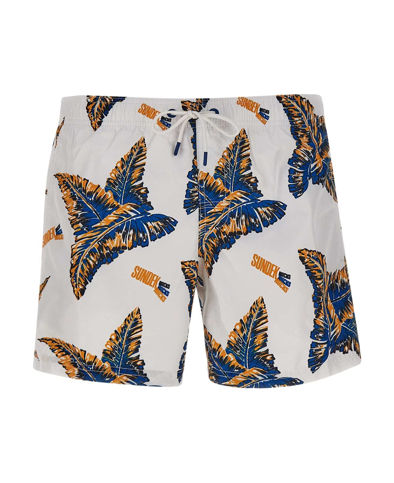 Sundek "Printed Boards" men's swimsuit, blue and beige leaves pattern on a white background, quick drying, lined in light white mesh, elasticated waist with matching drawstring, two side pockets, one back pocket with velcro and applied logo patch, regular fit.