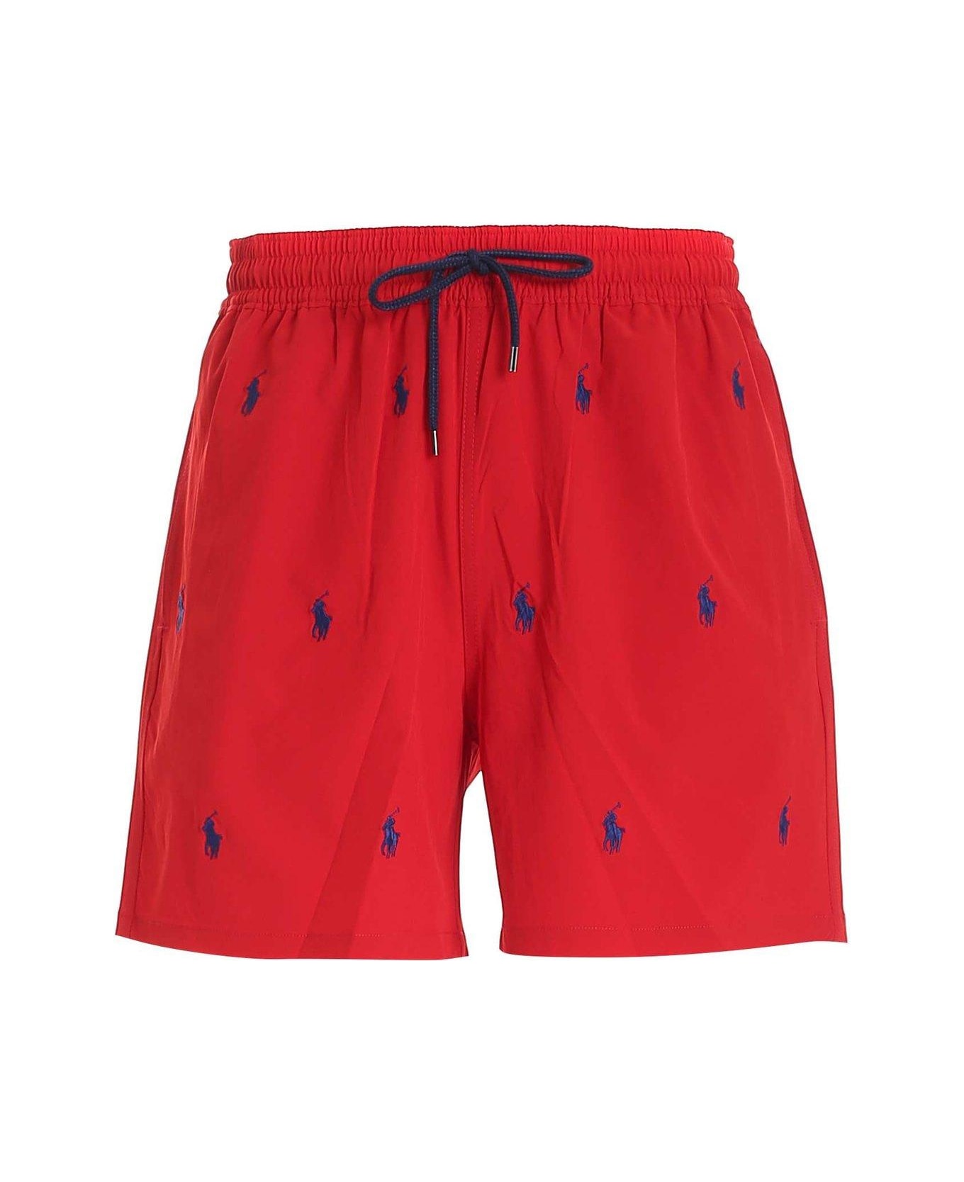 An iconic piece for summer, these POLO RALPH LAUREN swim shorts come in a vivid red hue enhanced with subtle embroidered logos. The lightweight and breathable fabric ensures comfort and style during beach days or by the pool.