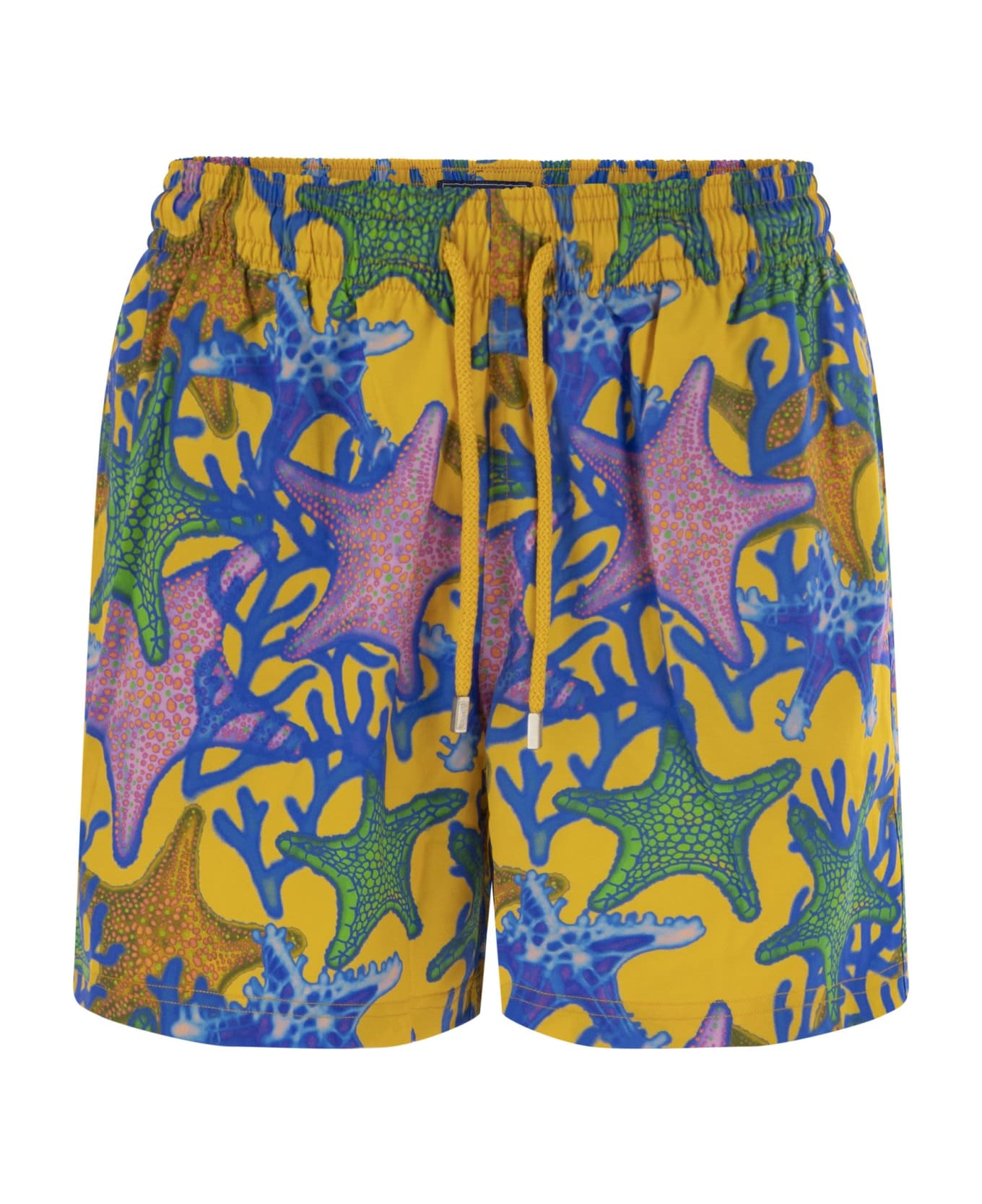 These short-cut and print beach shorts are made of recycled stretch polyamide and elastane for a comfortable fit. With elasticated waistband and drawstring. - Shorter cut swim shorts in stretch fabric - Elasticated waistband with drawstring and zamak ends with Vilebrequin engraving - Two side pockets and one couture back pocket with Velcro fastening - Two rear grommets allow water to drain away and reduce the 'balloon' effect when emerging from the water DESIGNER ID: MSOAF104 115