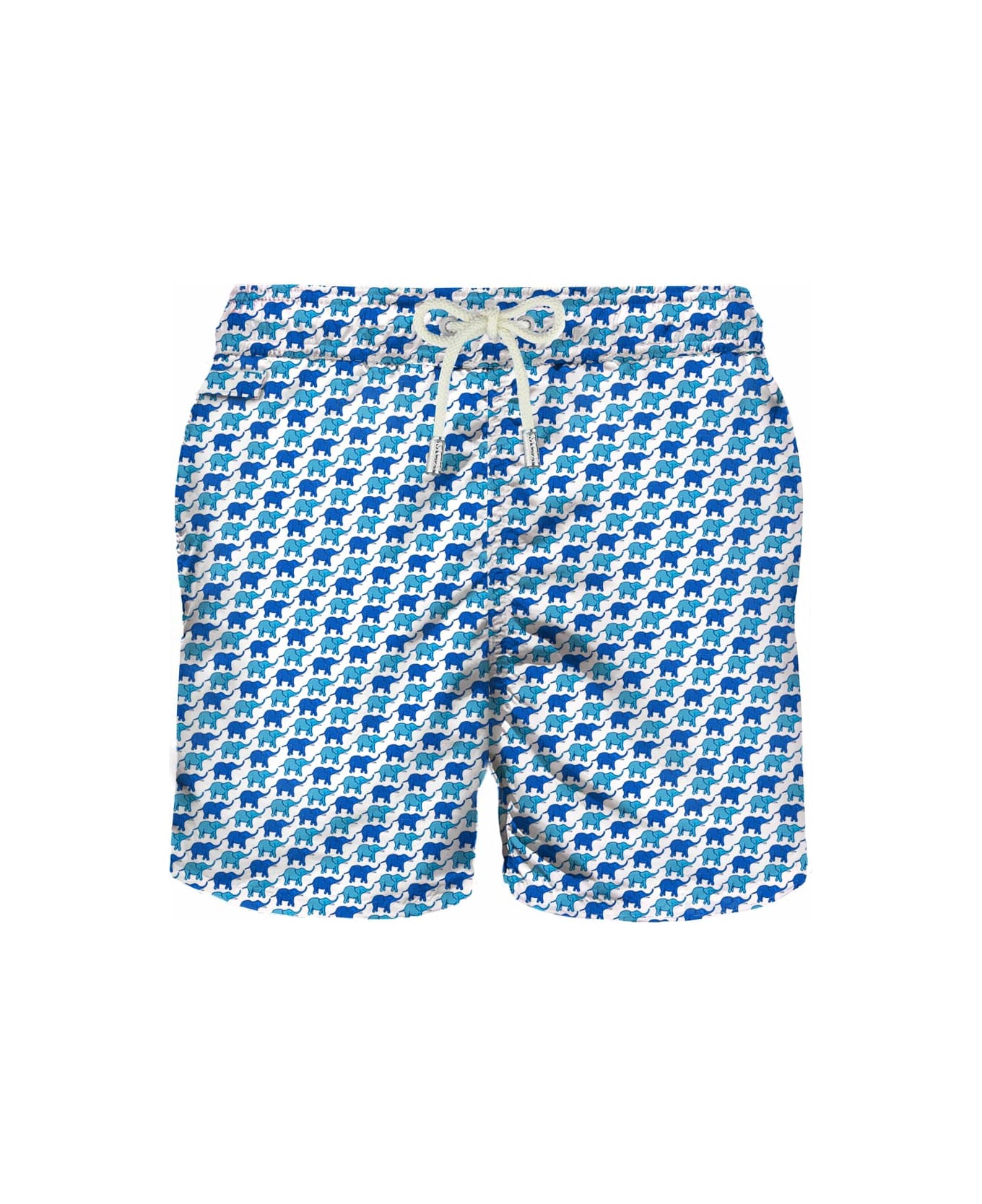 Discover the MC2 Saint Barth spring summer men's collection! A lot of funny and colored print are waiting for you and your amazing holidays and summer! MC2 Saint Barth man's classic swim short, light blue micro elephant all over print on white backcloth, light fabric, quick drying, mid-lenght, light net lining, elasticated waistband, drawstring fastening, front and back pocket with button.