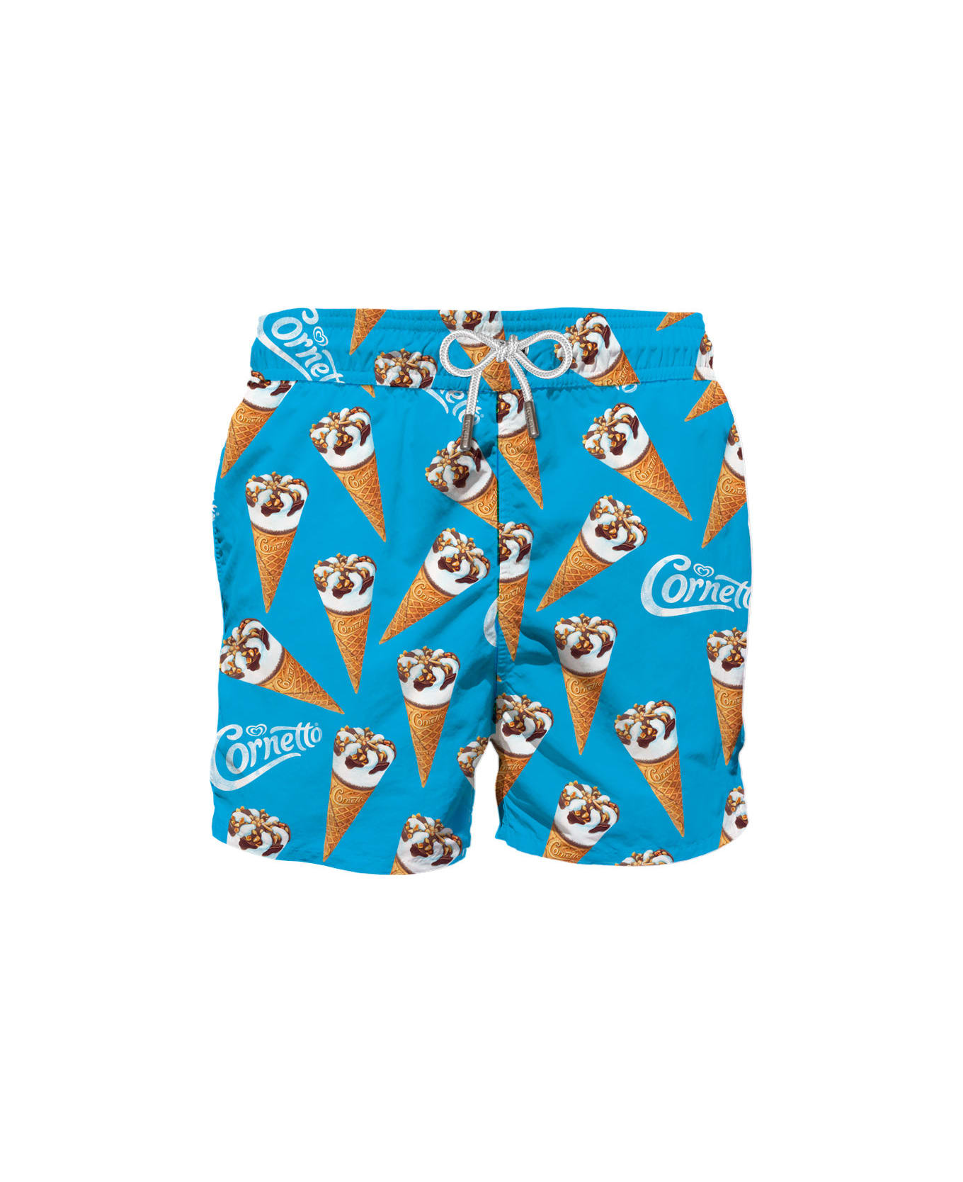 Man classic swim shorts Algida all over print Mid lenght Regular fit Internal briefs Elasticated waistband Drawstring fastening Front and back pockets Care instructions: Cold hand wash. Do not soak. Do not iron. Do not dry off in contact with other garments. Rinse after contact with chlorine or salt water Algida® Special Edition